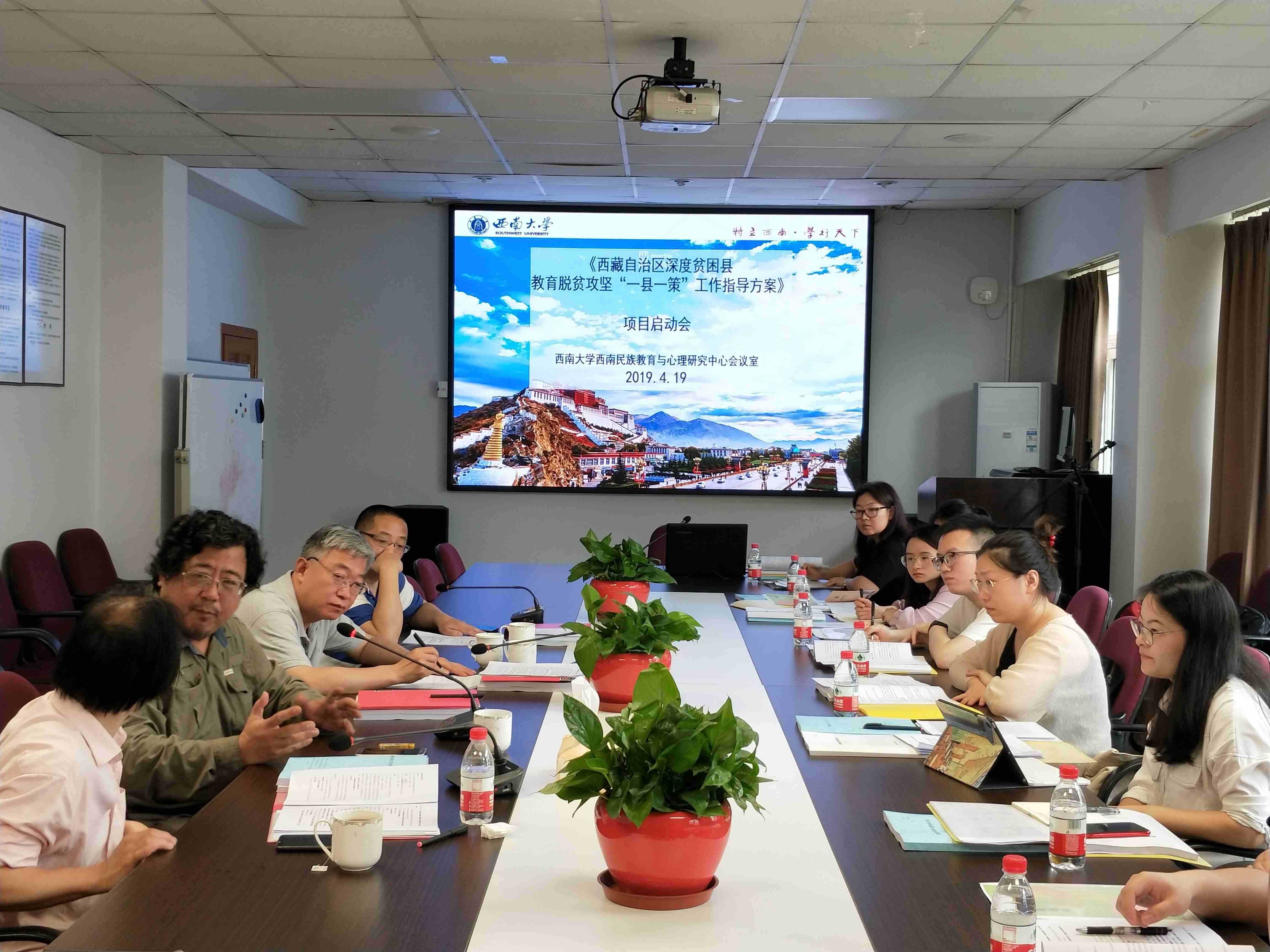 为深入贯彻落实习近平总书记在重庆考察期间主持召开的解决“两不愁三保障”突出问题座谈会上的重要讲话精神,助力教育脱贫攻坚战的最后胜利,学校承接了由教育部民族教育司和教育部民族教育发展中心委托的《西藏自治区深度贫困县教育脱贫攻坚“一县一策”工作指导方案》重大项目任务(以下简称“项目”),并于4月19日在教育部人文社科重点研究基地西南大学西南民族教育与心理研究中心(以下简称“中心”)荟文楼537会议室举行项目启动会。会议由中心主任张学敏主持,学校副校长、教育部民族教育发展中心民族教育发展与高层次人才培养重点研究基地(以下简称“基地”)主任崔延强,校医院副院长靳树芝,以及来自中心和教育学部的项目组师生成员参加此次会议。