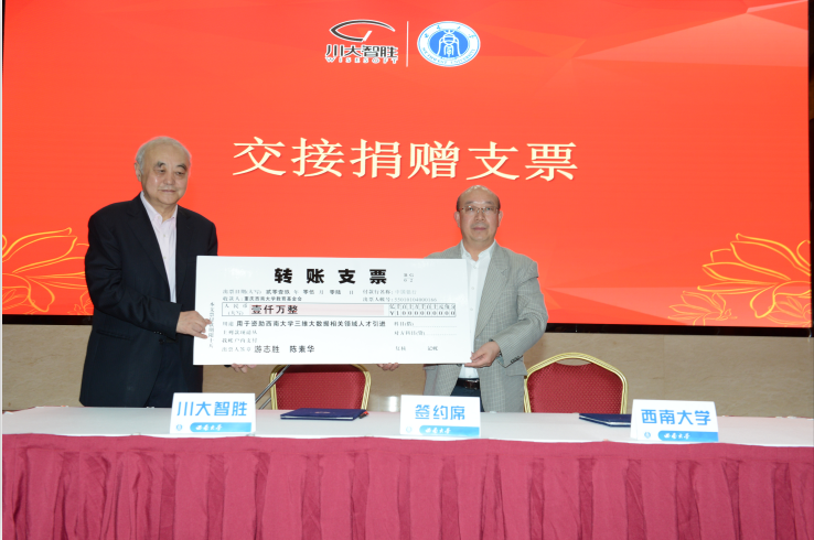 在仪式上,游志胜先生与其夫人陈素华女士以个人名义向西南大学捐赠1000万元人民币,用于资助学校三维大数据相关领域的人才引进。这将助力学校相关领域的科研工作迈上更高的台阶。陈素华女士是原西南师范学院数学系65级校友,这份捐赠也表达了她对母校的感恩之情。