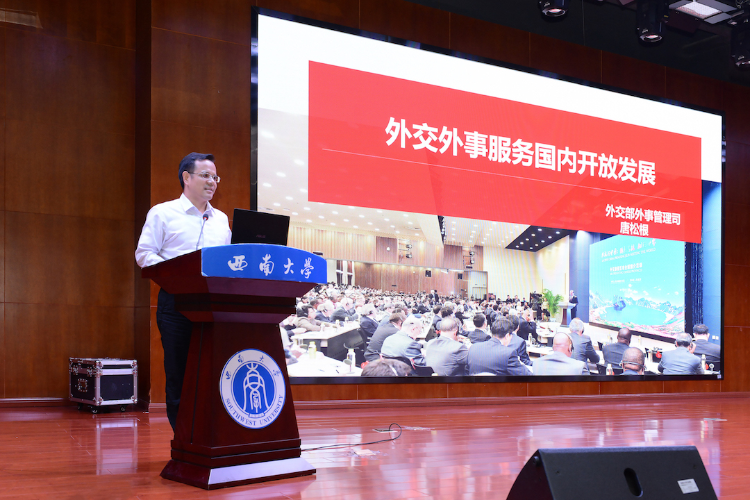 5月30日,2019年首场“外交外事知识进高校”活动重庆之行走进西南大学。外交部外事管理司副司长唐松根、领事司副司长陈雄风、新闻司参赞张宜琪等三位外交官和近500名师生面对面交流。重庆外办副主任唐文主持活动,学校校长张卫国、副校长王进军出席活动。