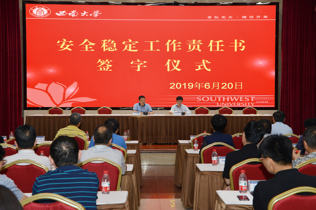 为做好学校安全稳定工作,落实二级单位主体责任,确保学校和谐、安全、稳定,6月20日下午,学校在东方红会议厅召开安全稳定工作部署会,举行安全稳定工作责任书签字仪式。党委书记李旭锋、校长张卫国与二级单位签订了安全稳定责任书。签字仪式由张卫国校长主持。