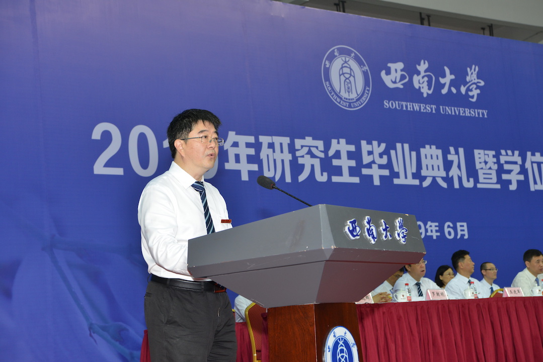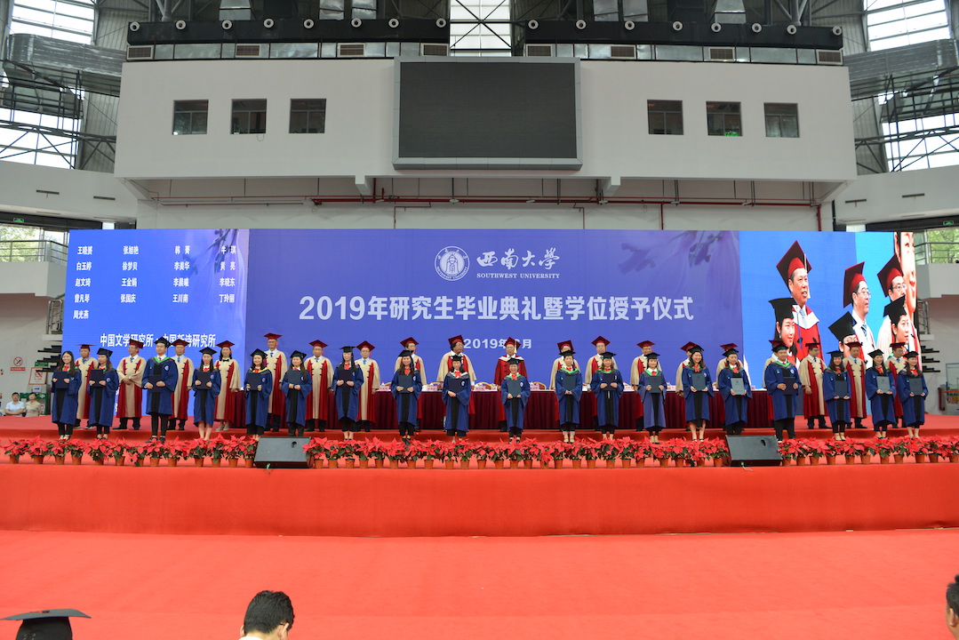 第一阶段,首先举行研究生毕业典礼。校领导、党委常委、校长助理,学校学生工作领导小组成员出席毕业典礼,典礼由学校党委副书记潘洵主持。毕业典礼在雄壮的国歌声中拉开帷幕,学校学位评定委员会副主席、党委书记李旭锋宣读了西南大学2019年研究生毕业决定和有关表彰决定;毕业生代表依次上台领取毕业证书;重庆市及西南大学优秀毕业研究生代表、基层就业优秀毕业研究生代表、优秀学位论文获得者代表分别上台接受表彰。