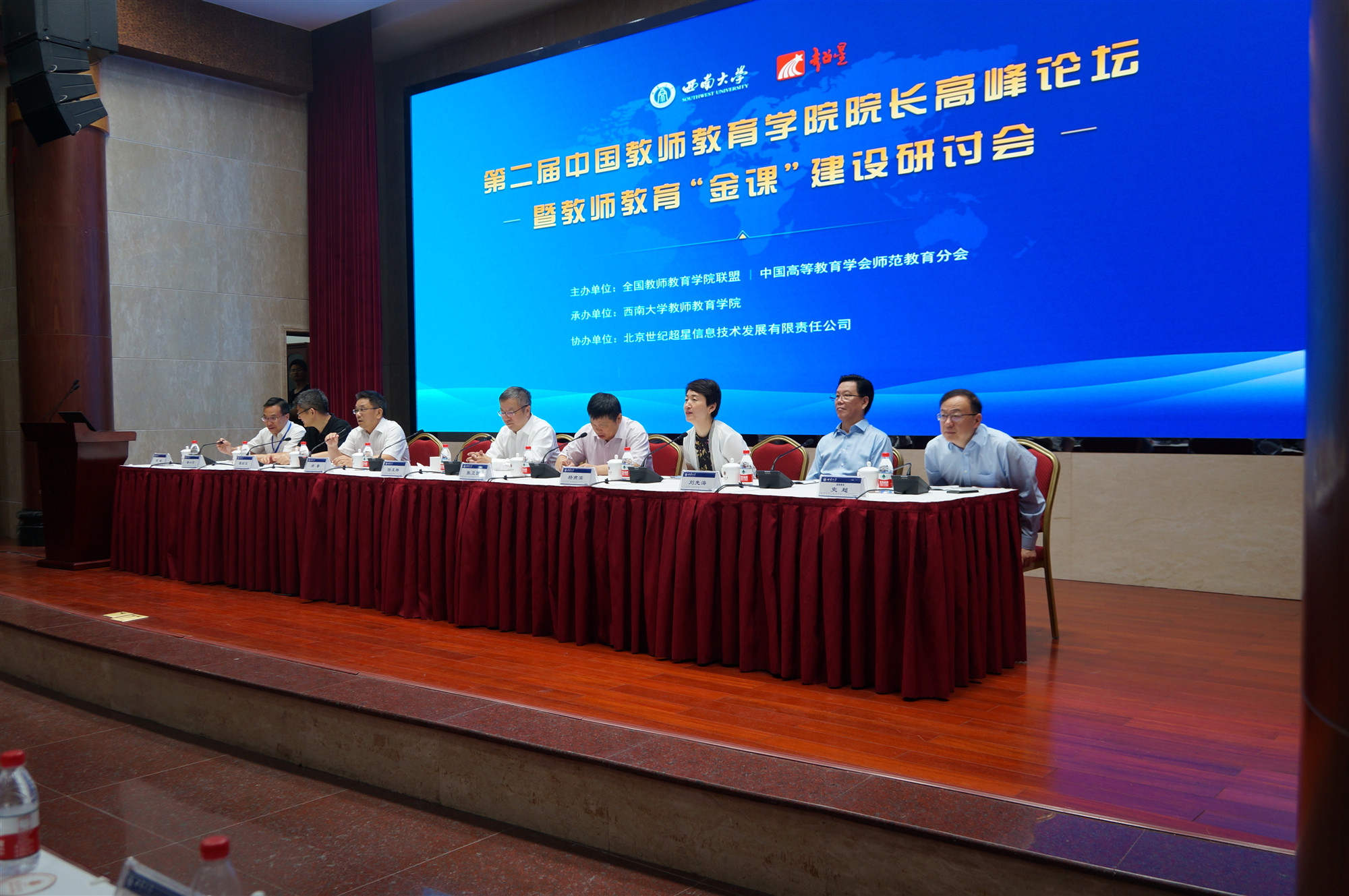 7月6日,由全国教师教育学院联盟与全国高等教育学会师范教育分会联合主办,西南大学承办,北京世纪超星信息技术发展有限责任公司协办的中国第二届教师教育学院院长高峰论坛暨教师教育“金课”建设研讨会在东方红会议厅召开。本次论坛的主题是:新中国成立七十年教师教育经验与未来展望,教师教育学科发展与师资队伍建设,教师教育“金课”建设及课程共享机制,新时代教师教育人才培养模式改革。来自全国30多所高校的100多位教师教育学院院长及专家齐聚一堂,共同商讨教师教育工作发展前景。教育部教师工作司司长任友群、副司长杨燕滨、教师管理处处长黄小华、重庆市教育委员会副主任邓睿、副巡视员刘先海、西南大学校长张卫国、副校长陈时见、北京超星集团董事长史超出席会议。