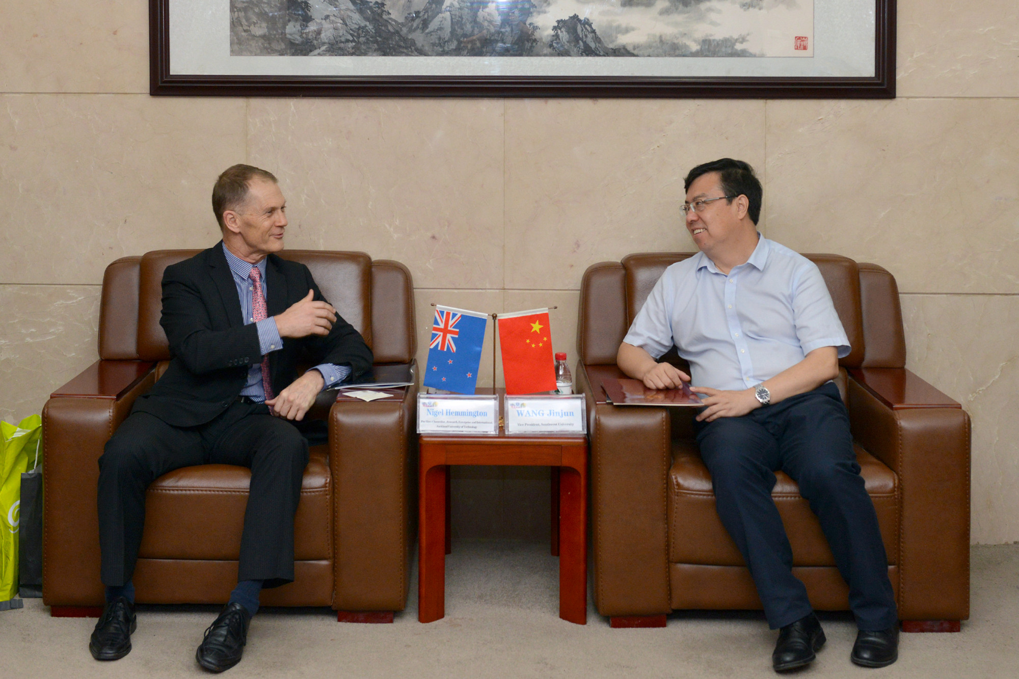 王校长热情欢迎奈杰尔副校长一行,向客人介绍了学校的办学历史、现状及国际化发展战略等,希望通过奈杰尔副校长一行的来访,推动学校与奥克兰理工大学师生交流和科研合作等。奈杰尔副校长十分高兴与西南大学建立起交流合作的桥梁,他向王校长介绍了奥克兰理工大学的办学情况,表示非常乐意推动两校在科学研究和其他领域上的交流与合作。
