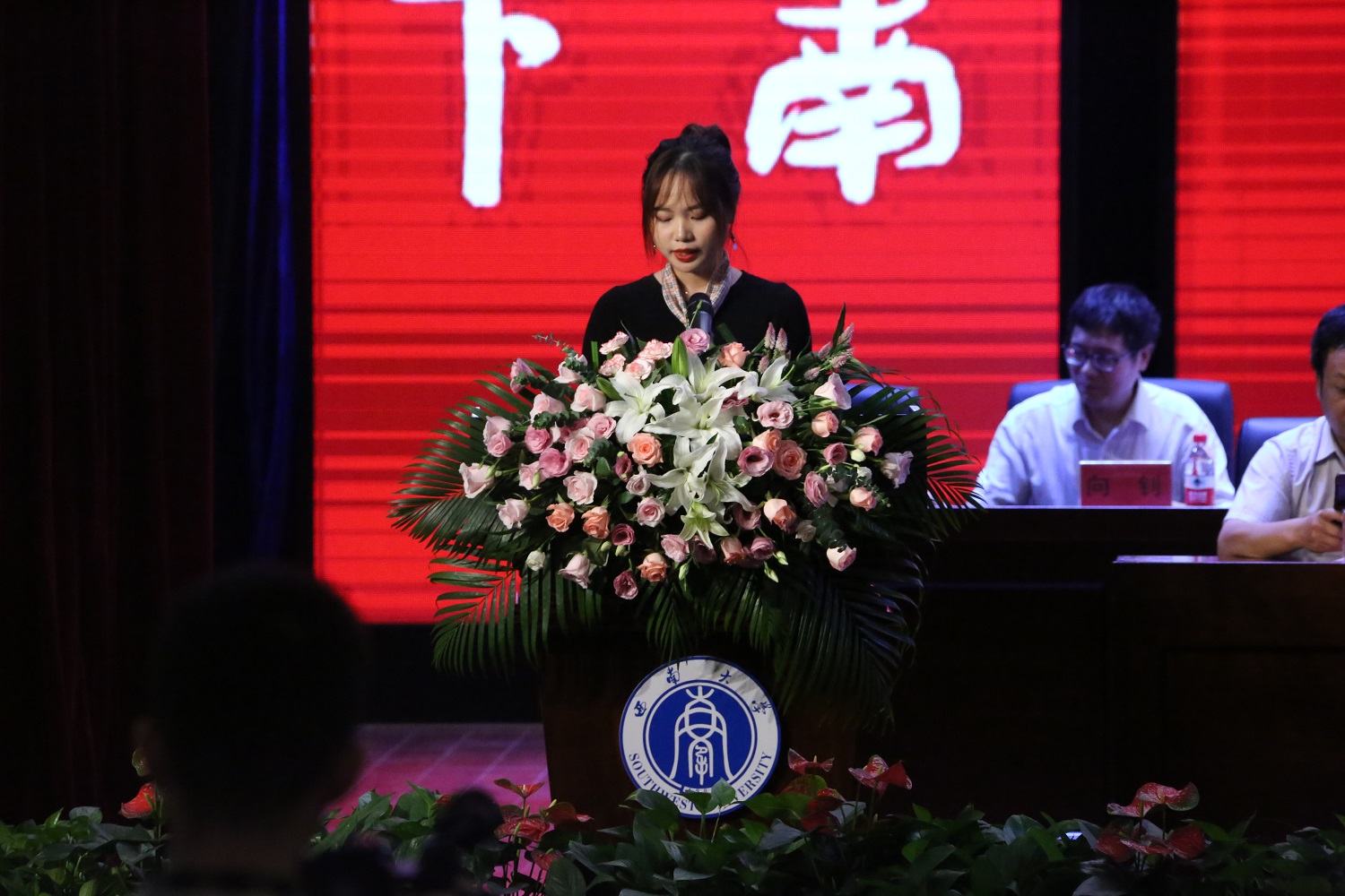 动物科学学院2019级刘舒琦同学代表新生发言。她说,进入西大不是结束,只是开始,我们要继续努力学习、奋力成材,不负青春、不负时代。