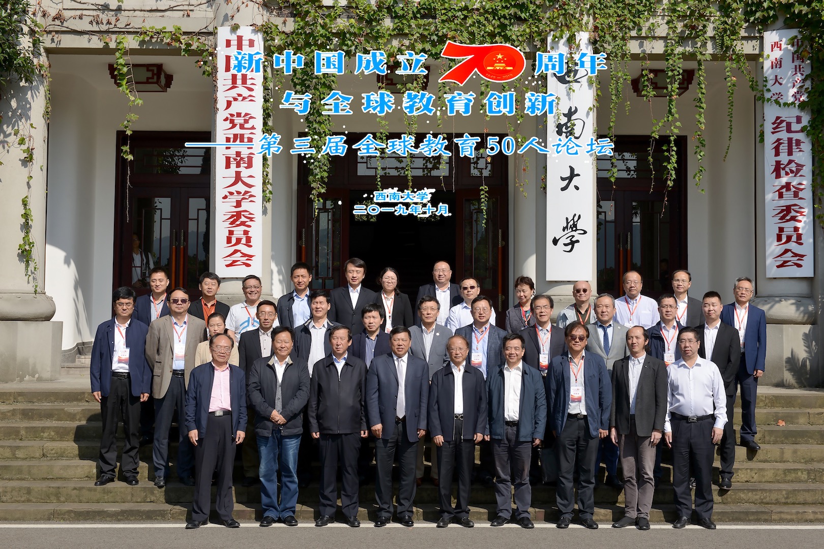 为庆祝新中国成立70周年,总结中国教育发展的经验,探索全球教育创新,展望全球教育发展动态,10月19日,第三届全球教育50人论坛在校举行。本届论坛以“全球教育创新暨2035、2050教育展望”为主题,由西南大学、全球教育50人论坛和清华大学民生经济研究院主办,清华大学当代中国研究中心、清华大学社会与金融研究中心、西南财经大学资本市场研究院和小平故里书院协办。
