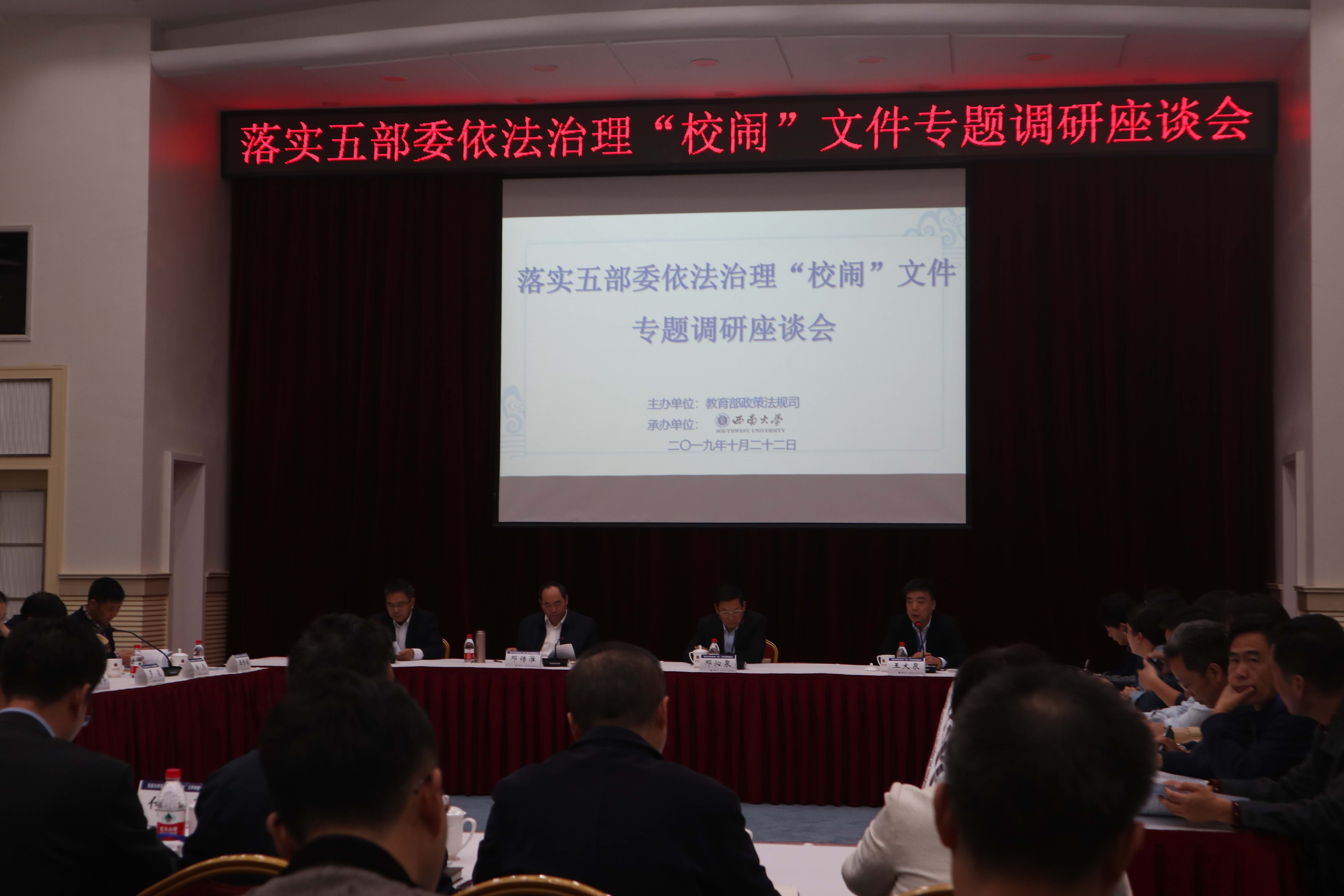 10月22日,由教育部政策法规司主办、西南大学承办的落实五部委依法治理“校闹”文件专题调研座谈会在校举行。教育部政策法规司司长邓传淮、学校副校长陈时见、重庆市教委副主任邓沁泉出席会议并致辞。教育部政策法规司副司长王大泉主持调研座谈会。