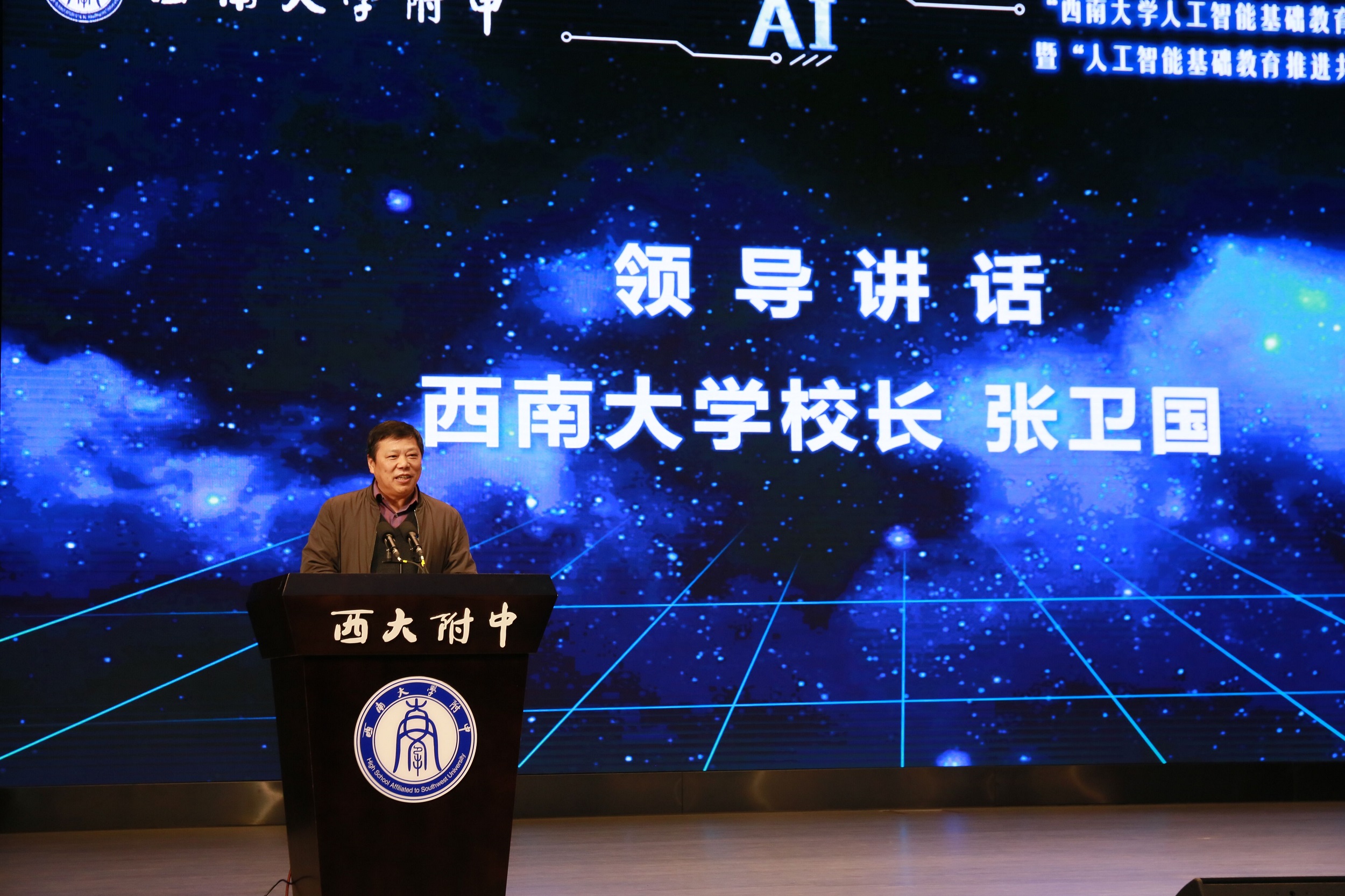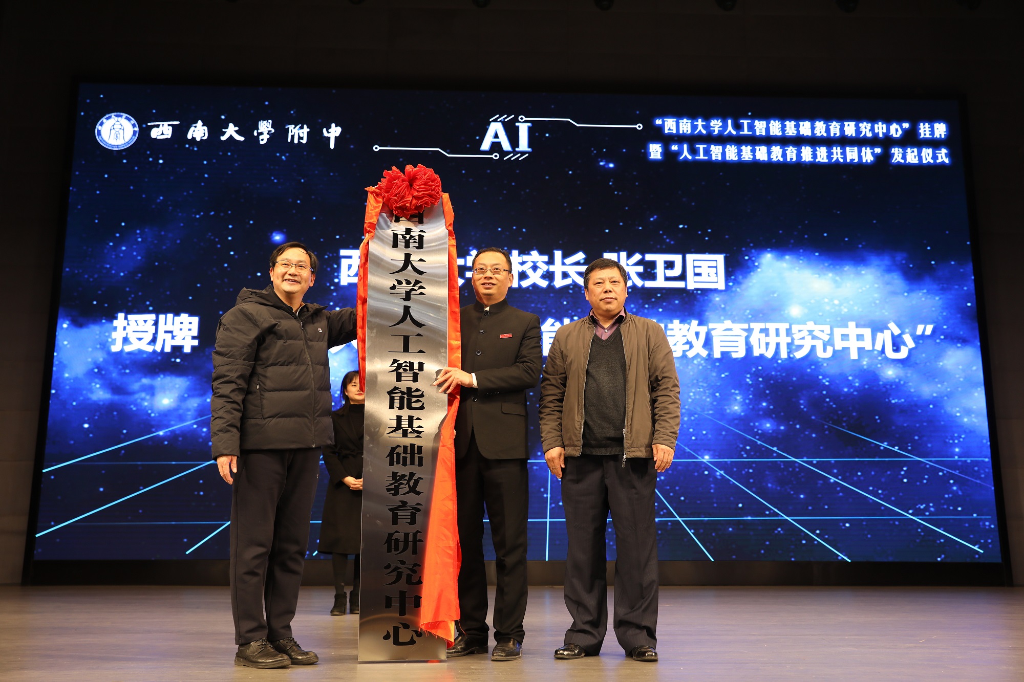 张卫国校长向人工智能学院副院长段书凯、附属中学校长欧健授牌“西南大学人工智能基础教育研究中心”。