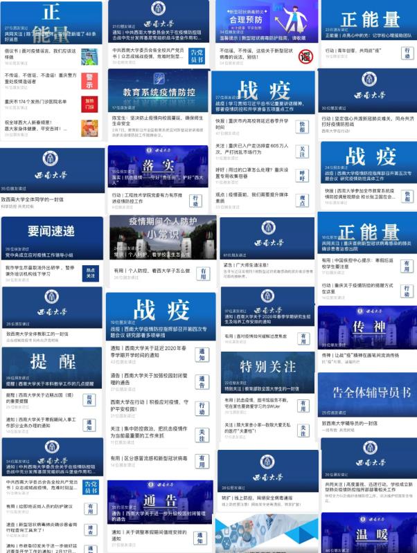 为全面做好新冠肺炎疫情防控特殊时期宣传工作,坚决打赢疫情防控阻击战,学校党委宣传部、党委网络工作部在学校疫情防控指挥部的统一部署下,充分利用官方网络新媒体矩阵,及时发布相关通知通告及防控工作安排,普及科学防控知识,挖掘一线师生“战疫”故事,引导广大师生员工理性应对疫情,在网上吹响“战疫”集结号。在不到一个月的时间里,学校官方微信共发布“战疫”相关推文65篇;官方微博推送疫情相关内容71条;官方抖音等视频平台共发布各类师生原创短视频15个。其中,官方微信通过搜集整理留校师生抗击疫情的真实事例,发布《请放心,我在西南大学很好!》等系列推文,生动还原学校防疫工作启动以来师生携手共克时艰的点点滴滴;通过整合西大学子抗疫事迹,发布《我们是青年一代,我们想做更多!》等系列推文,展现每一个西大学子面对疫情时的责任与担当。官方微博发起网络接力“我承诺,防控疫情,有我”行动,吸引数千名师生参与,纷纷在微博留言,承诺以身作则,防控疫情。相关推文、微博引起师生、校友强烈反响,引起社会广泛关注,在网上凝聚了西大人抗击疫情的力量。