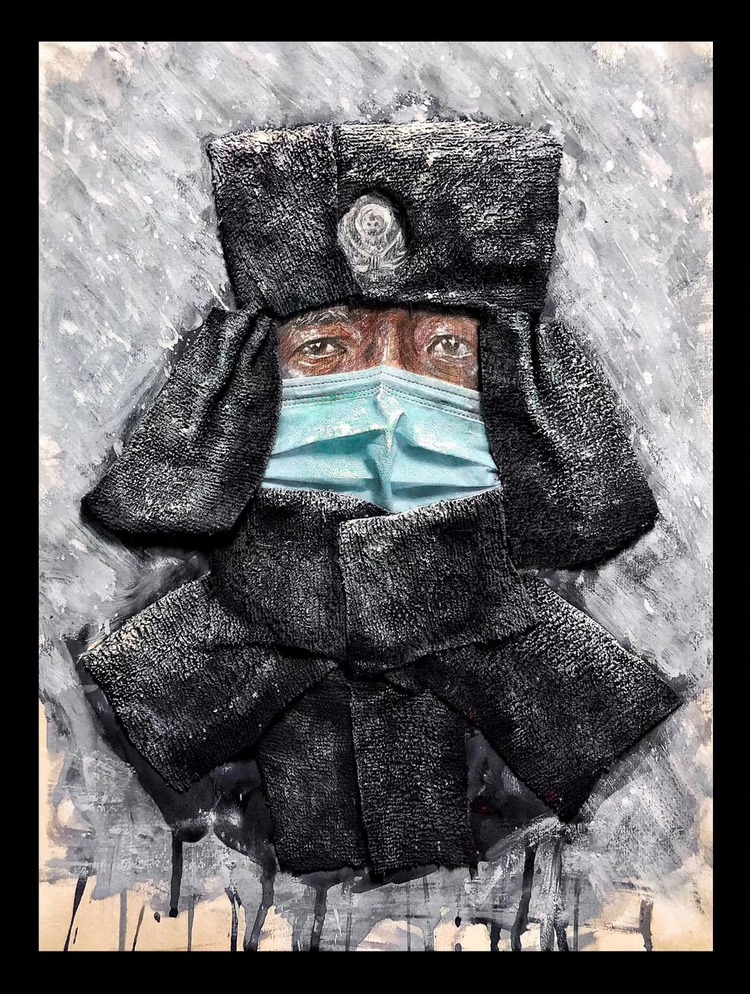 近日,西南大学美术学院本科2018级雕塑专业学生刘昱伽在家中拿起画笔,利用废弃口罩、旧抹布、旧报纸、包装袋等材料,创作出了一幅幅感人的画作。