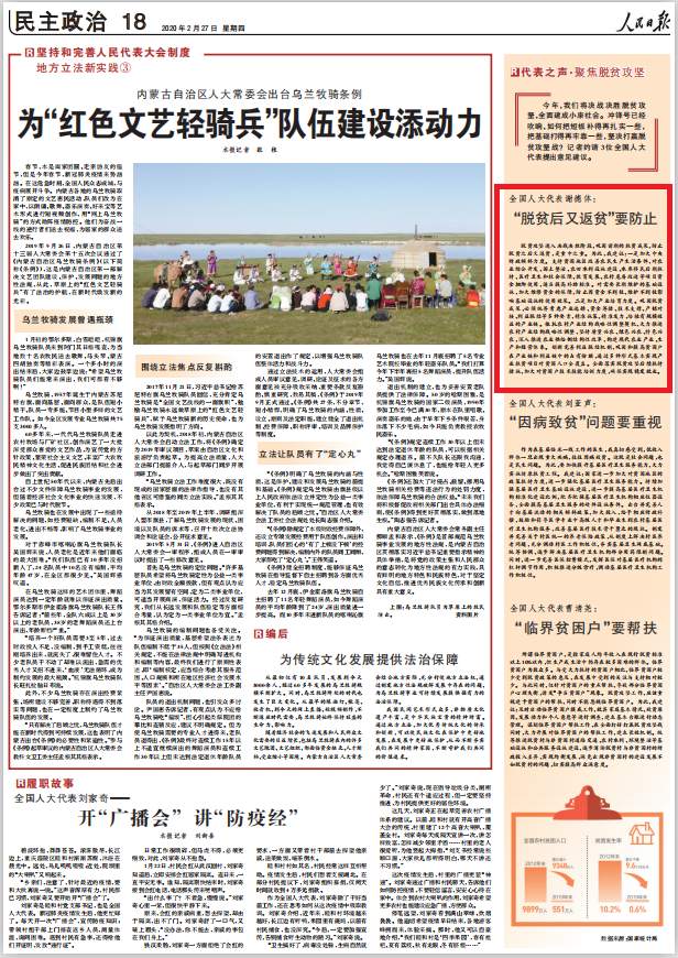 脱贫攻坚进入决战决胜阶段,巩固前期的扶贫成果,防止脱贫之后又返贫,是重中之重。为此,我建议:一是加大中央财政倾斜力度。支持贫困地区改善农民生产生活条件,对农业综合开发、国土整治、农田水利设施建设、水库移民后期扶持、医疗卫生和社会保障、教育发展、农村危房改造等项目资金捆绑使用,适当提高补助标准。对需要长期维护的基础设施,加大维修资金的保障,防止因资金不到位、维护不到位影响基础设施的使用效果。二是加大产业培育力度。巩固脱贫成果,必须统筹考虑产业选择、资金筹措、技术支撑、产销对接、利益联结等多种要素,精准施策、精准发力,培植有规模效益的产业链。依托农村产业结构战略性调整契机,大力推进农村产业结构战略性调整,坚持质量兴农、绿色兴农、特色兴农,深入推进农业供给侧结构性改革,构建现代农业产业、生产和经营体系。创新完善利益联结机制,巩固和提高贫困户在产业链和利益链中的占有份额,通过多种形式基本实现产业扶贫项目对贫困人口全覆盖。全面落实脱贫攻坚后续扶持措施,加大对贫困户技术技能培训力度,确保实现稳定就业。