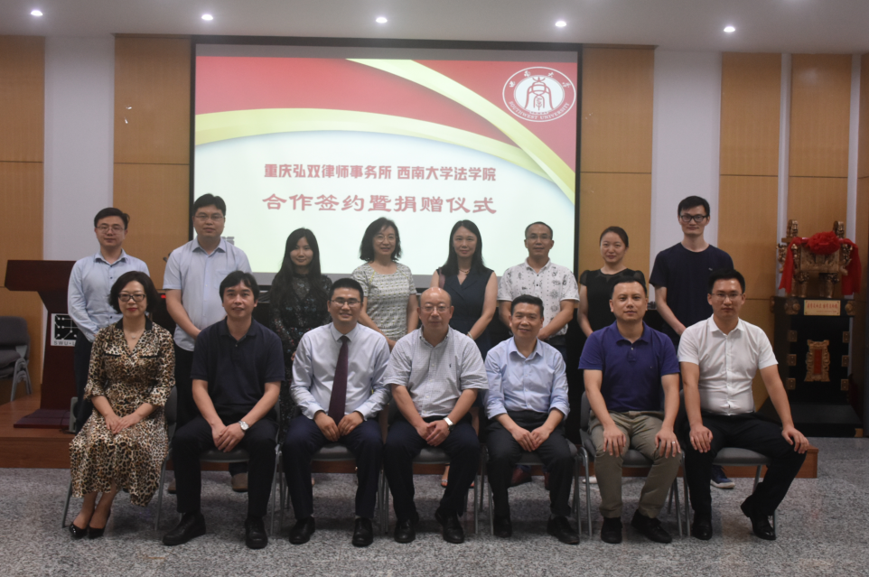 7月1日下午,重庆弘双律师事务所与西南大学合作签约暨捐赠仪式在法学院举行。重庆弘双律师事务所执行主任、合伙人牟均发一行出席签约仪式,学校对外联络办公室、法学院相关负责人参加签约仪式。