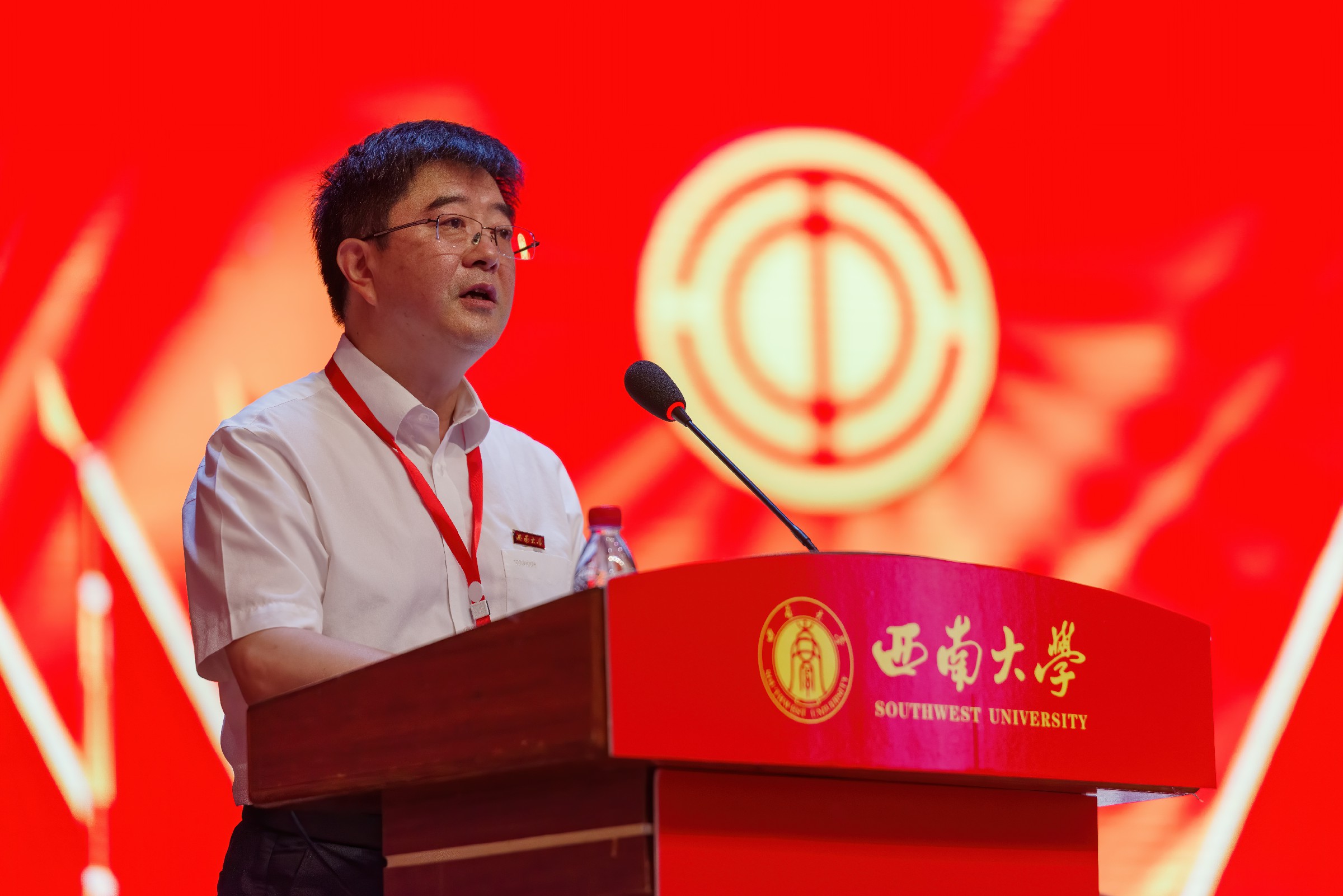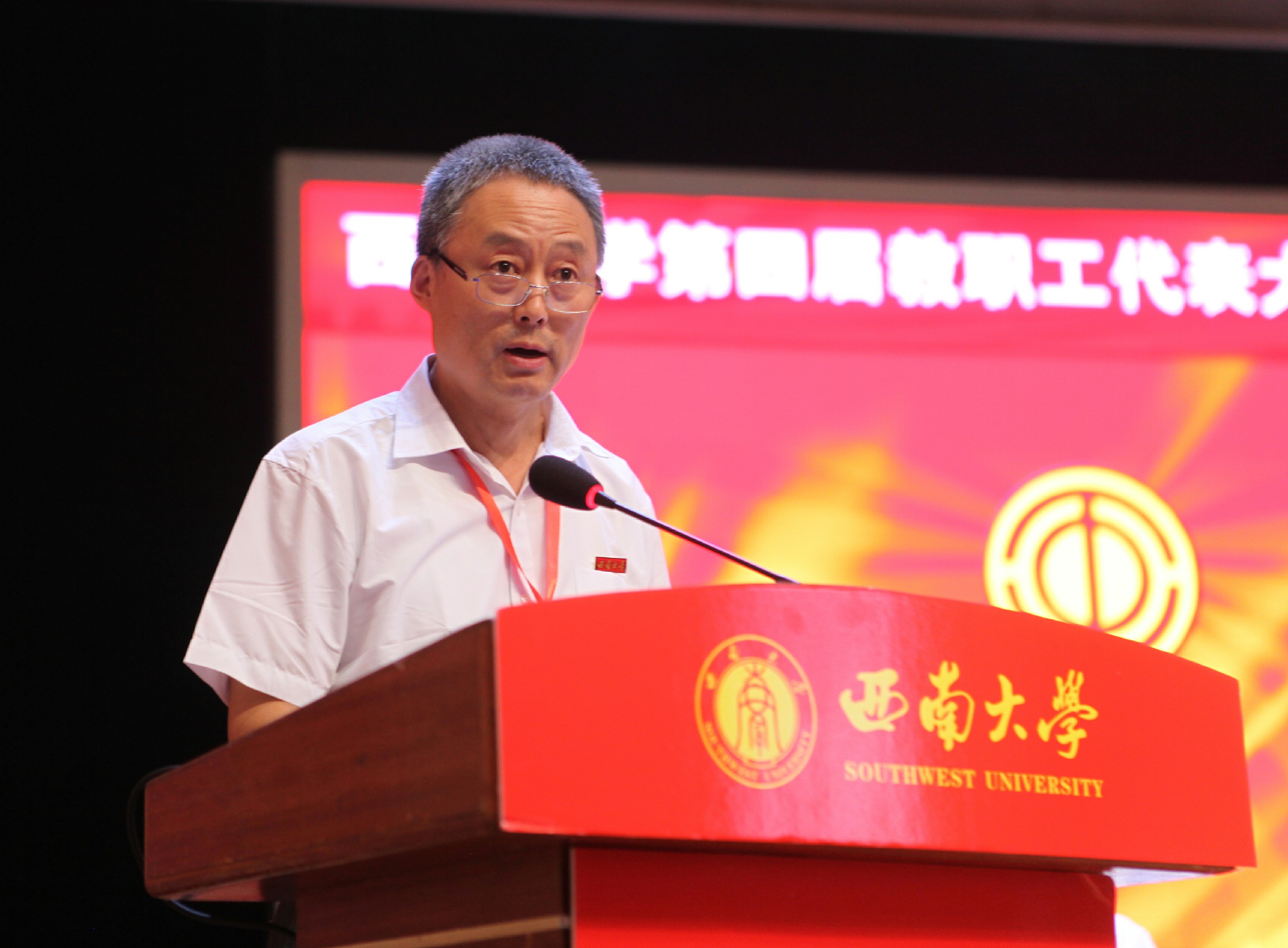 重庆市总工会一级巡视员、重庆市教科文卫体工会主席杨军波致辞,预祝大会圆满召开。杨军波充分肯定了西南大学第三届工会在学校党委的正确领导和行政的重视支持下,紧紧围绕学校中心工作,自觉服务学校发展大局,在引领教职工思想、助力教职工建功立业、推进健全规范化民主管理、促进校园文化建设、开展教职工文化体育活动、关心关爱教职工等方面卓有成效的工作。并对学校工会的开展提出三点建议:一是履行政治责任,团结带领职工群众坚定不移听党话、跟党走。二是紧扣时代主题,组织动员广大教育工作者立足本职建功立业。三是真诚服务职工,不断提升职工群众的获得感、幸福感、安全感。