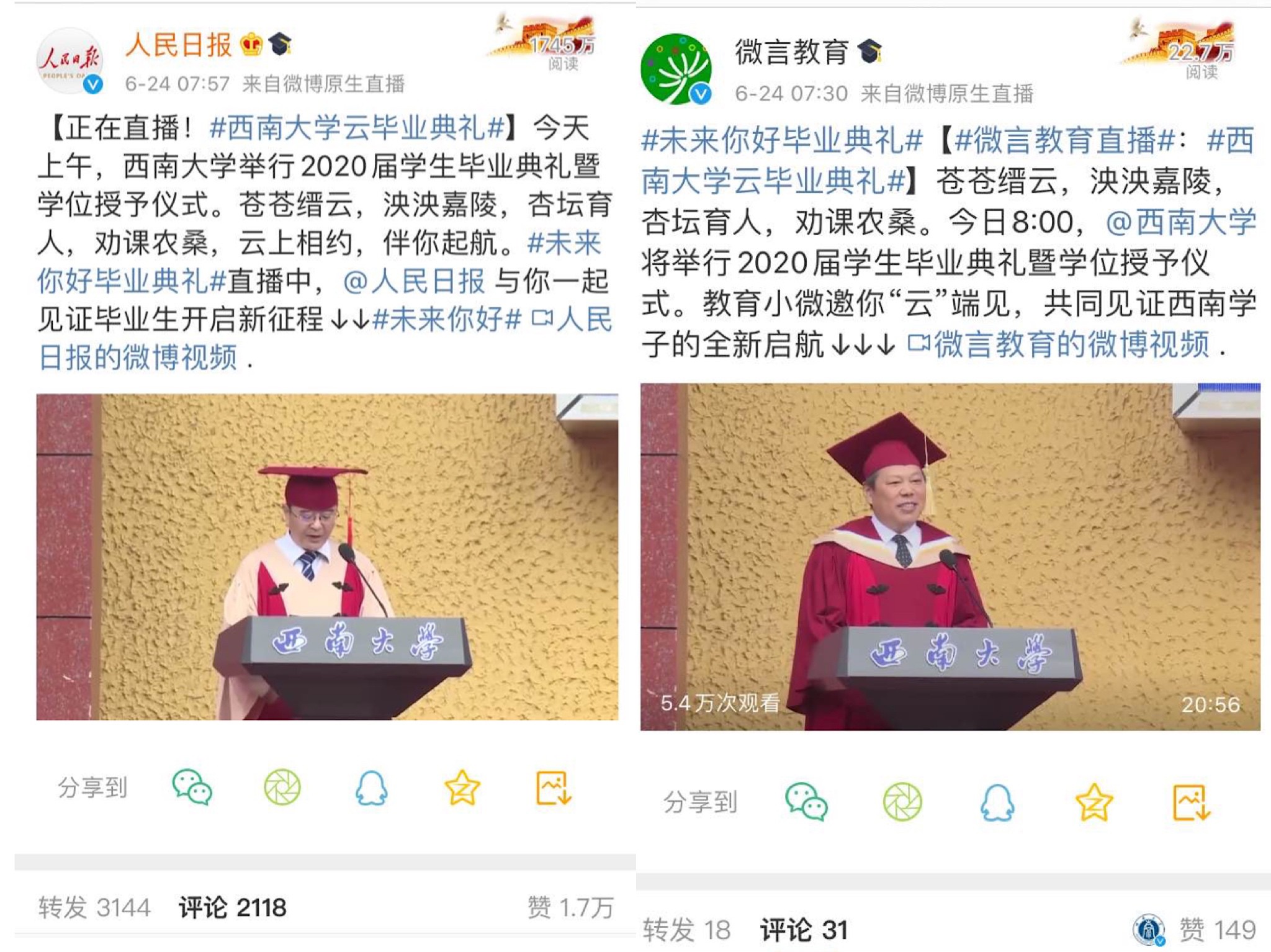 受新冠肺炎疫情的影响,学校2020届1万余名毕业生与全国874万毕业生共同度过特殊难忘的毕业季。这个毕业季,学校官方微博积极参与《人民日报》、微言教育及微博联合发起的“未来你好 毕业典礼”大型网络“云典礼”活动,取得圆满成功。