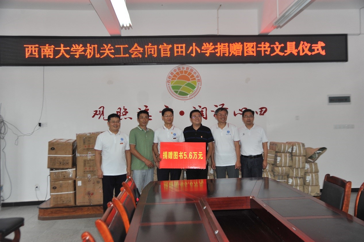在中益乡,官田小学校长谭久远为志愿者们介绍学校基本情况,中益乡副乡长郎滔对西南大学为中益乡做的教育扶贫表示感谢。机关党委有关负责人代表学校向官田小学捐赠5.6万余元的小学生课外读物书籍1900余册,以及书包、水彩笔等一批文具。他表示,还将继续发挥学校在基础教育学科方面优势,凝聚机关各单位力量,与官田小学建立教育帮扶长效机制,为“两不愁三保障”中的“义务教育有保障”贡献力量。