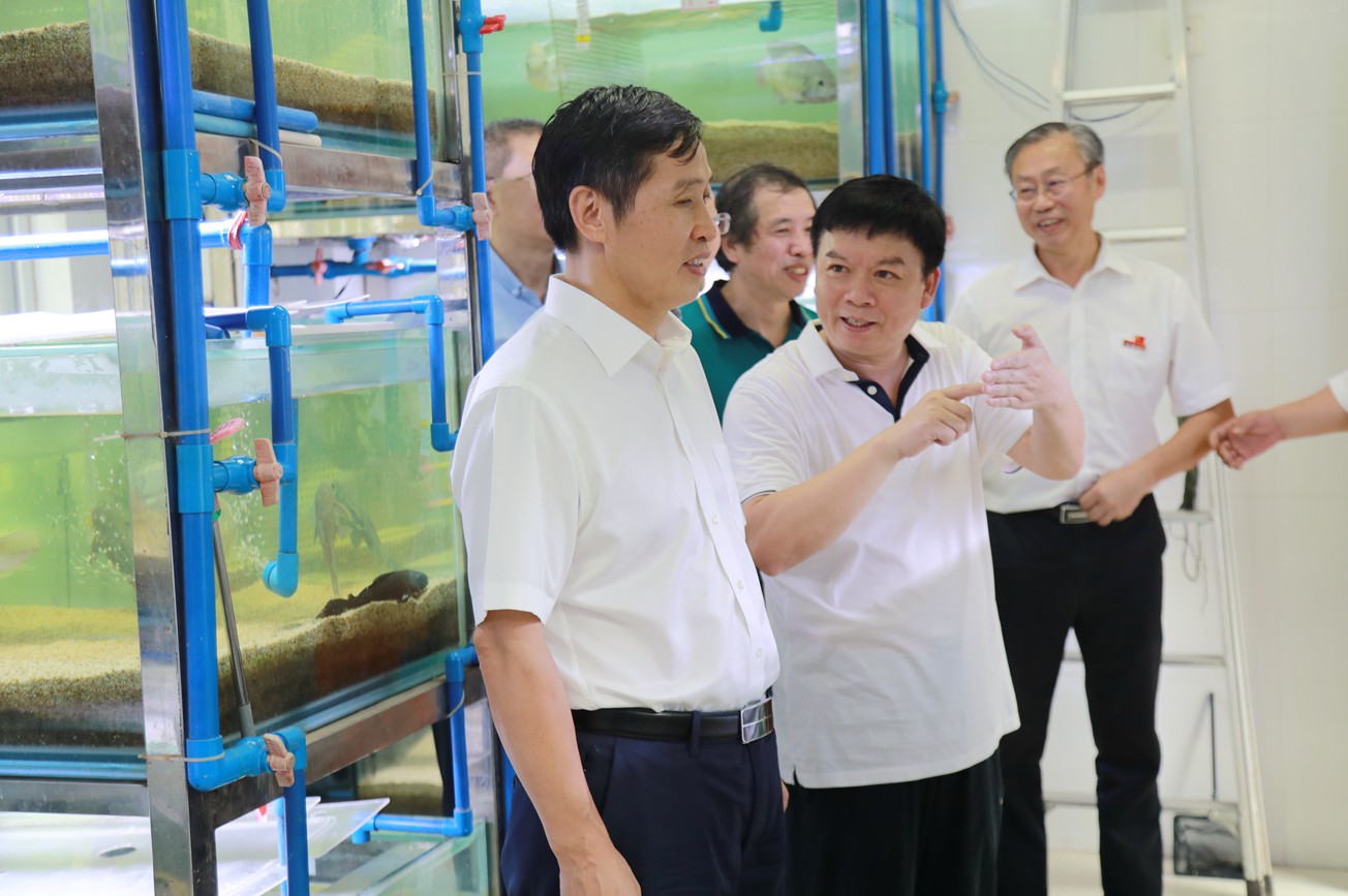 随后,钟登华一行来到淡水鱼类资源与生殖发育教育部重点实验室,参观实验室标本馆,听取了实验室负责人对实验室研究方向、取得的成果的介绍,重点了解了罗非鱼进行性别调空、体色控制,全雄罗非鱼的育种方面的进展情况。