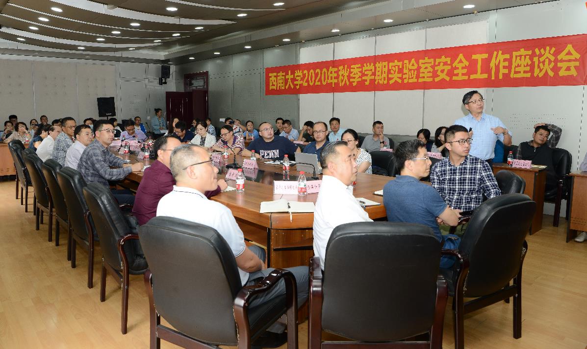 2020年秋季学期实验室安全工作座谈会上,实验室建设与设备管理处负责人和彭华松与到会的23个自然科学类二级单位实验室安全分管领导和安全员进行了交流。