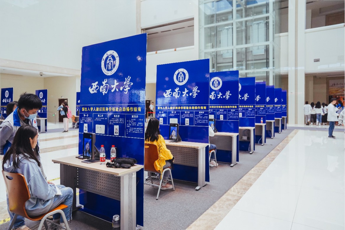 为做好本次新生身份核验工作,学校定制开发了西南大学2020级新生人脸识别身份核验系统,安装18组高识别率高防伪三维人脸识别核验设备,采用多视角人脸识别及高精度三维人脸识别技术,与新生电子档案逐一比对核查,实现入学新生本人、身份证芯片内置照片、高考报名照片三比对。