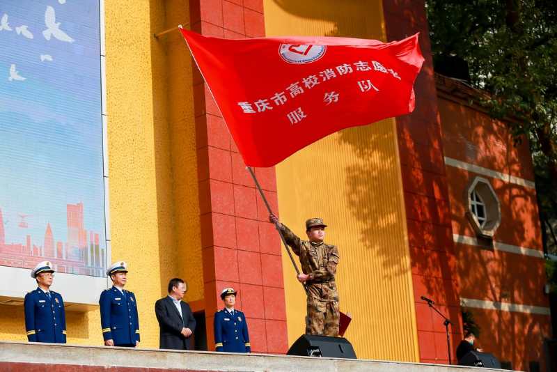 启动仪式上,西南大学消防志愿者代表向全市高校学生发起积极参与消防志愿服务的倡议,市消防救援总队总队长李俊东为高校消防志愿者服务队授旗。