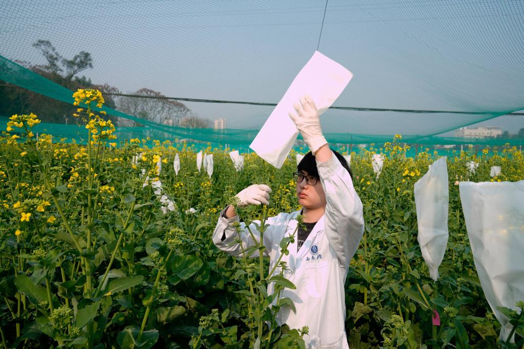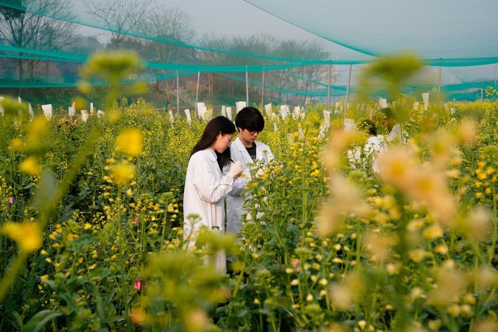 时下正值油菜花期,位于重庆市北碚区的重庆市油菜工程技术研究中心内各色油菜花陆续开放,西南大学农学与生物科技学院的专家带领学生和技术工人抢抓农时,推进油菜科研和育种工作。