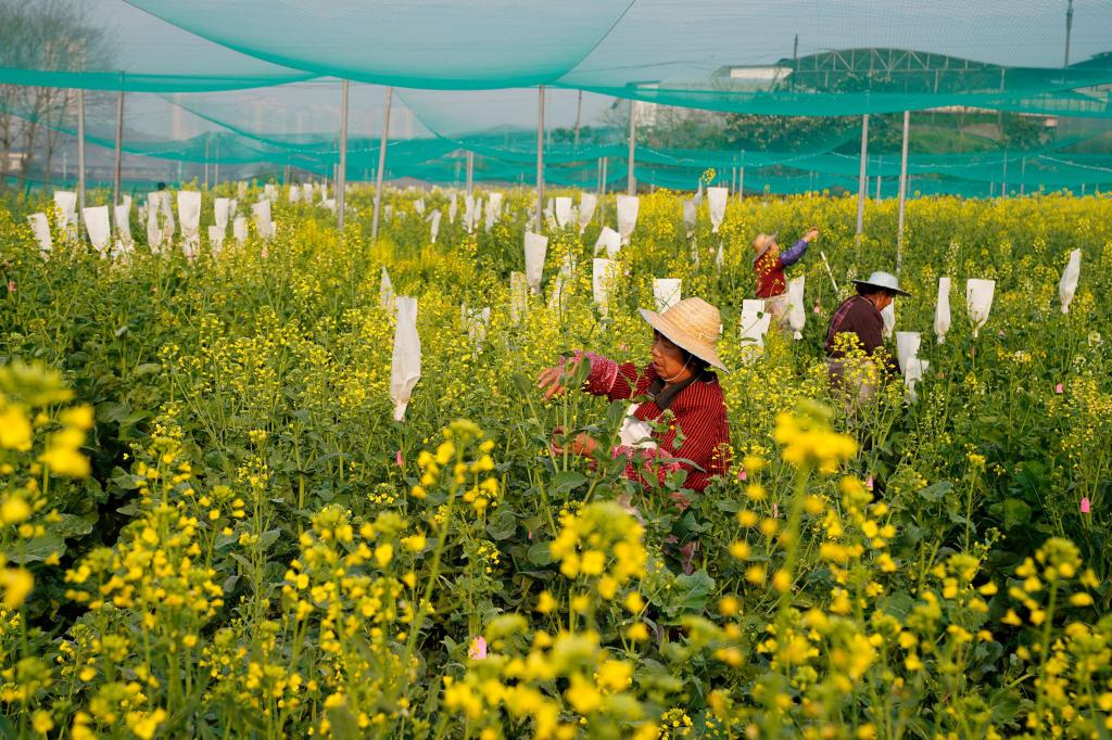 ↑2月22日,在重庆市油菜工程技术研究中心,西南大学农学与生物科技学院的学生在给油菜花套袋。