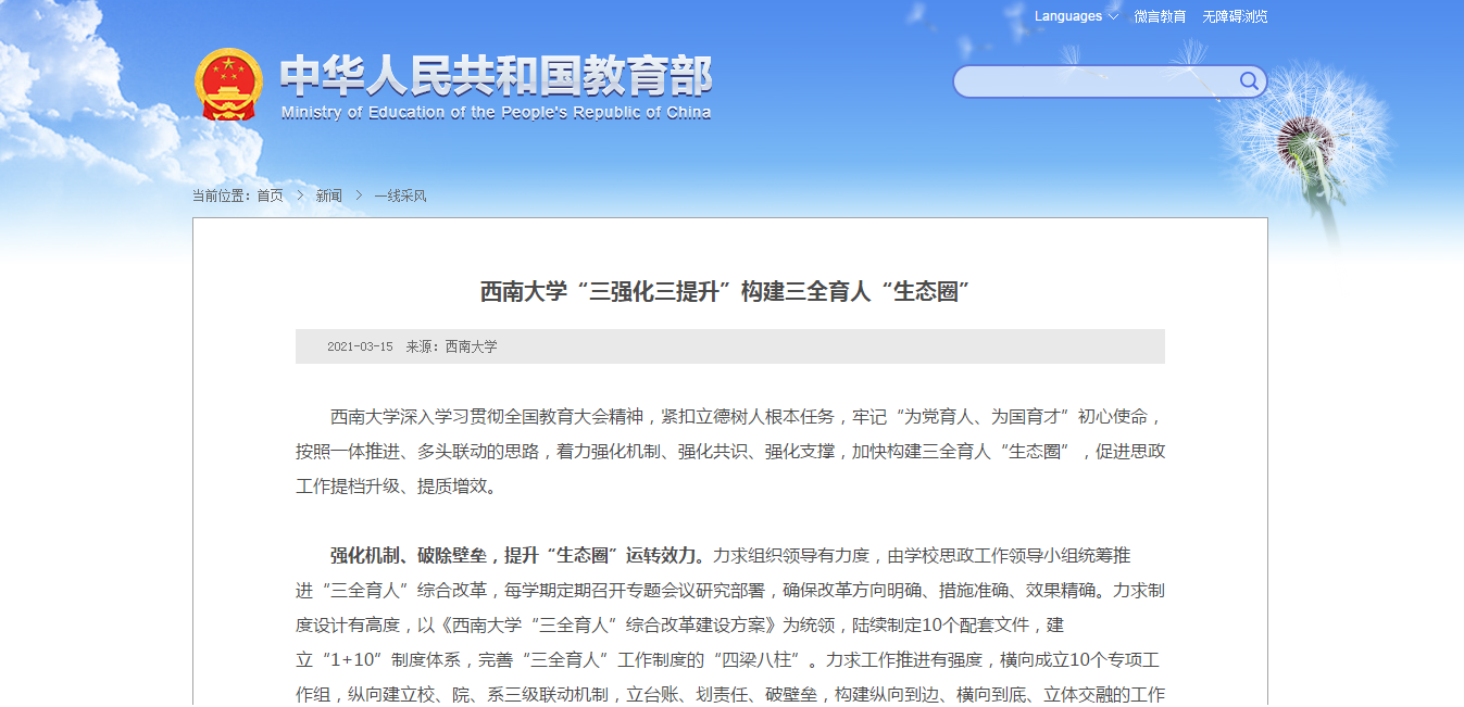 西南大学“三强化三提升”构建三全育人“生态圈”