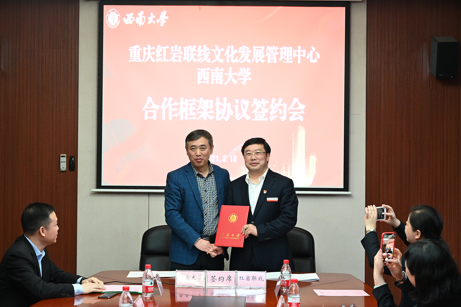 学校党委书记李旭锋、校长张卫国高度重视整合地方资源开展党史学习教育与思政课程创新。展演开始前,学校与重庆红岩联线文化发展管理中心举行合作框架协议签约会,学校党委副书记潘洵与重庆红岩联线文化发展管理中心党委副书记、主任马奇柯签署合作协议。