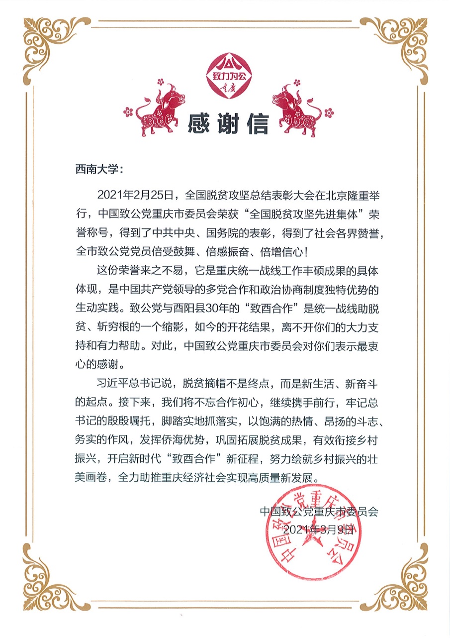 近日,致公党重庆市委会向学校发来感谢信,信中写道,致公党重庆市委会荣获“全国脱贫攻坚先进集体”荣誉称号,荣誉的获得是中国共产党领导的多党合作和政治协商制度独特优势的生动实践,并向学校大力支持致公党重庆市委会开展“致酉合作”助力脱贫攻坚工作表示最衷心的感谢。