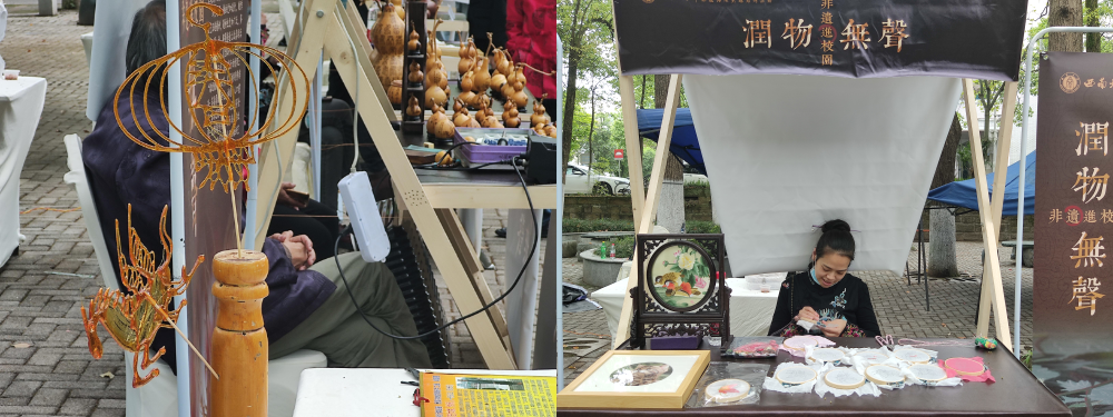 本次活动展出的荣昌陶器是中国四大名陶之一,起源于汉代,兼具观赏性和实用性,有“红如枣、薄如纸、声如磬、亮如镜”的美誉,学校和荣昌区共建的“西南大学荣昌非物质文化遗产研究中心”在现场展示荣昌陶器的制作流程及其精美艺术品。夏布是荣昌著名的传统手工艺品,以独特的编织工艺被评为我国非物质文化遗产,作为教育部首批中华优秀传统文化传承基地的西南大学“重庆荣昌夏布织造技艺传承基地”师生团队重点展示了夏布制作工艺及其精美艺术品。活动还邀请重庆市级非遗传承人进校园现场展示糖画、捏面人、葫芦烙画、蜀绣等传统技艺的制作过程,师生通过现场互动进行深入了解。