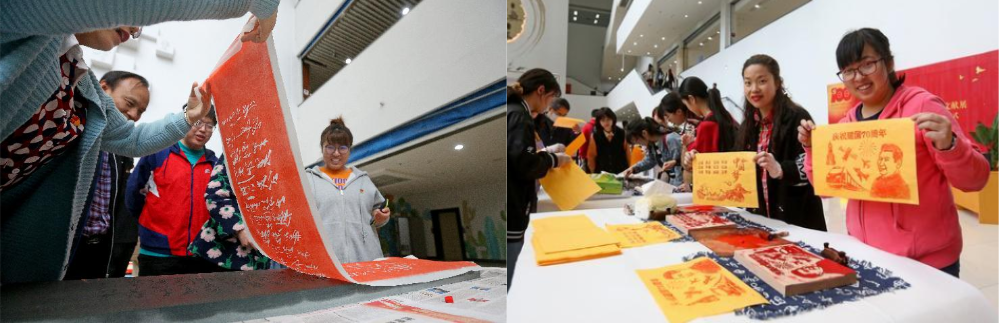 此外,为进一步提升活动效果,学校图书馆还在馆藏文献展展区旁设置“永远跟党走”主题展,用数十幅美术作品生动呈现中国共产党成立至今各个时期的重大历史事件,展示中国共产党的奋斗历程和光荣传统。并联合西南大学学生书法协会,共同准备了红色主题的活字印刷术、雕版印刷术、传拓、书法、篆刻等传统技艺体验活动。师生可通过读、赏、写、拓、刻、印等多种形式,在动手做中学习党史。