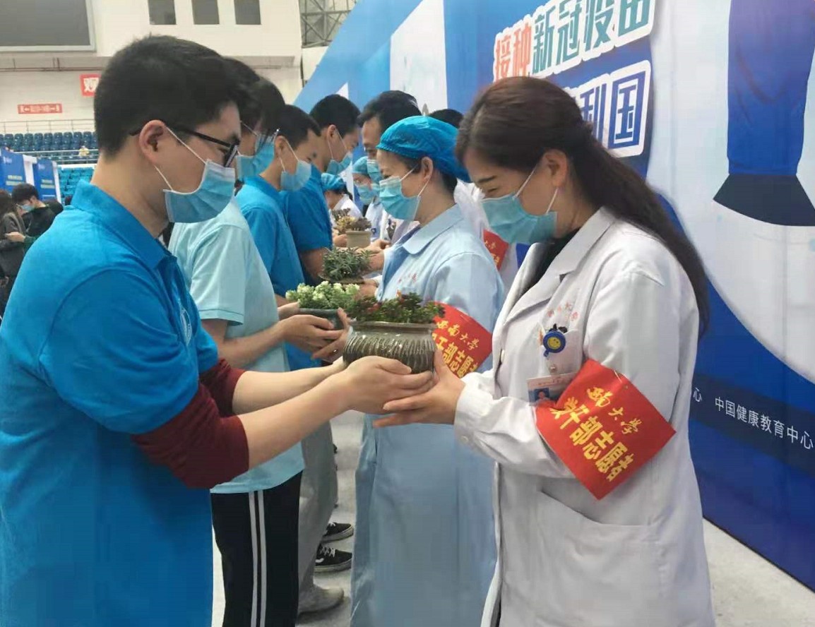 4月22日下午,本次接种接近尾声时,在西南大学中心体育馆上演了温馨一幕,农学相关专业同学和志愿者们为众多医务人员送上自己栽种的花苗与温暖的拥抱,每个人脸上都露出幸福的笑容,画面温馨十足,几天的辛苦疲劳都在爱中慢慢消除。