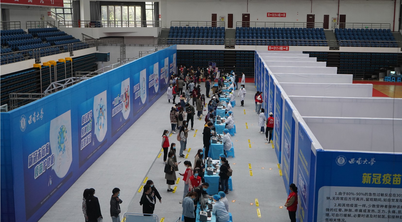 根据教育部、重庆市政府和市教委的工作要求,4月18日下午开始,西南大学组织全校师生在学校中心体育馆开展大规模集中接种新冠疫苗。相关情况受到人民网、新华社等多家媒体广泛报道。