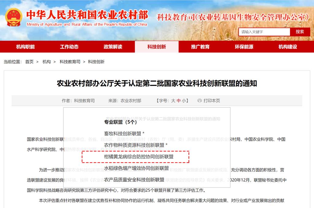 为进一步推动国家农业科技创新联盟健康发展和高质量运行,及时总结、积极推广联盟建设发展的新成效,营造联盟建设发展的良好环境,2020年12月,中国科学院科技战略咨询研究院第三方评估研究中心受联盟秘书处委托对各联盟开展以协同协作的运行机制、解决重大问题的效果、对行业或产业发展的贡献为主要依据的第三方评估工作。根据评估结果,近日,农业农村部认定由学校牵头的柑橘黄龙病综合防控协同创新联盟为第二批国家农业科技创新联盟。