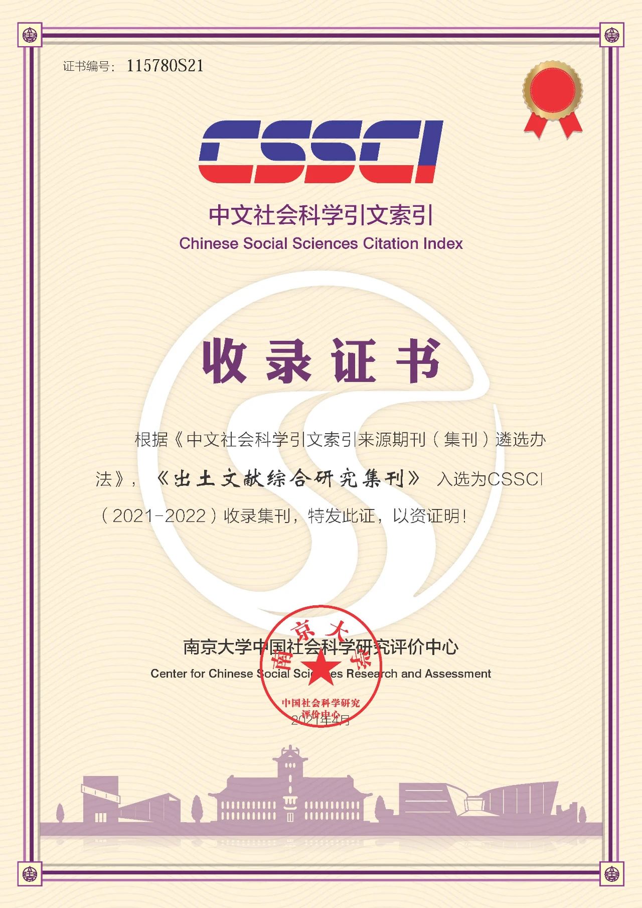 近日,西南大学汉语言文献研究所接到南京大学中国社会科学研究评价中心来函通知:根据《中文社会科学引文索引来源期刊(集刊)遴选办法》,《出土文献综合研究集刊》入选为CSSCI(2021-2022)收录集刊。据悉,这是《出土文献综合研究集刊》2014年创刊以来,首次入选为CSSCI来源集刊。