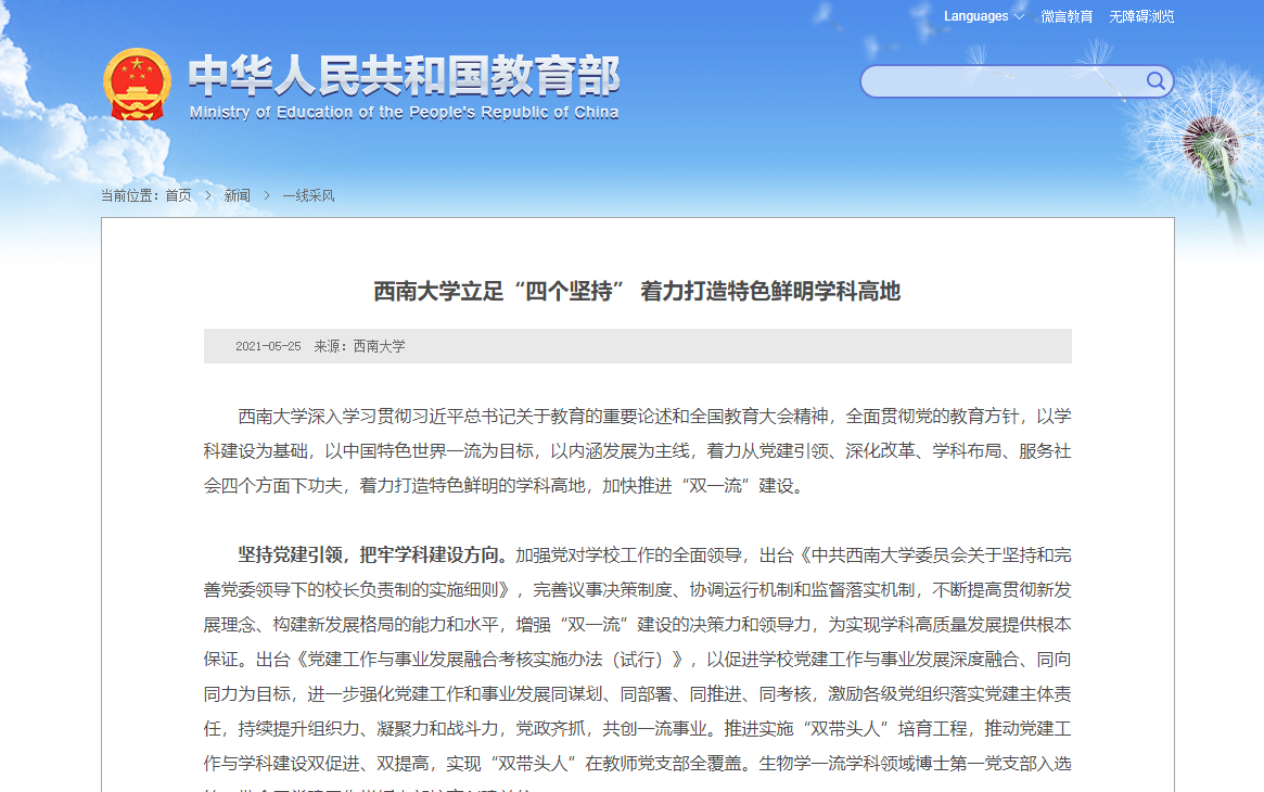 近日,学校学科建设工作受到教育部“一线采风”单篇报道,相关内容由党政办公室和发展规划与学科建设部报送。教育部网站报道原文如下:
