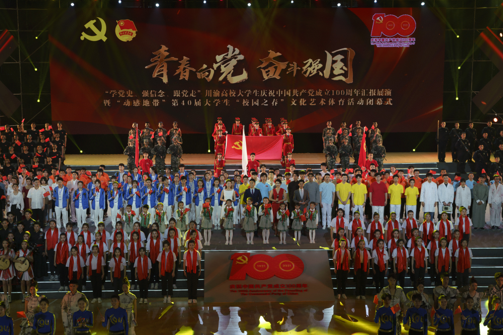 5月26日下午,川渝大学生庆祝中国共产党成立100周年汇报展演暨“动感地带”第40届“校园之春”文化艺术体育活动闭幕式在西南大学中心体育馆举行。团重庆市委书记张继军、副书记黄永宜,重庆市委宣传部二级巡视员钱陵,团四川省委副书记任世强,西南大学党委书记李旭锋、党委副书记潘洵,以及重庆市委宣传部、重庆市教委、团重庆市委和来自全市68所高校的分管领导等1500余名师生代表参加活动,吸引180余万人次在线观看闭幕式网络直播。