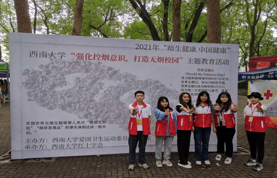 强化控烟意识,打造无烟校园。为深入贯彻国务院、教育部及重庆市政府关于深入开展爱国卫生运动的意见精神,创建无烟学校,弘扬健康向上的社会风气,营造无烟、清洁、健康的校园环境,提高师生员工的健康意识和观念,倡导健康的生活方式,5月31日,由校爱国卫生运动委员会办公室、校医院、校红十字会主办,校红十字会学生分会、少数民族志愿者部协办的“强化控烟意识,打造无烟校园”2021年世界无烟日主题教育活动在学校南区樟树林举行。