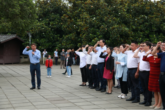 次日清晨,三校全体党员在潘洵同志和李敏同志的带领下,驱车前往朱德同志故居纪念馆开展“传承红色基因、汲取信仰力量”党史学习教育活动。全体党员在朱德同志汉白玉雕像前肃立,向朱德塑像敬献花篮,西南大学历史文化学院党委书记罗庆昌、西华师范大学历史文化学院党委书记杨敏和重庆师范大学历史与社会学院党委书记王丽萍为花篮整理绶带。全体党员聆听了微型党课《朱德同志光辉人生留给我们的启示》,潘洵带领全体党员,面向鲜红的党旗,右手握拳高举,怀着无比激动的心情重温入党誓词,再次领悟入党的初心。