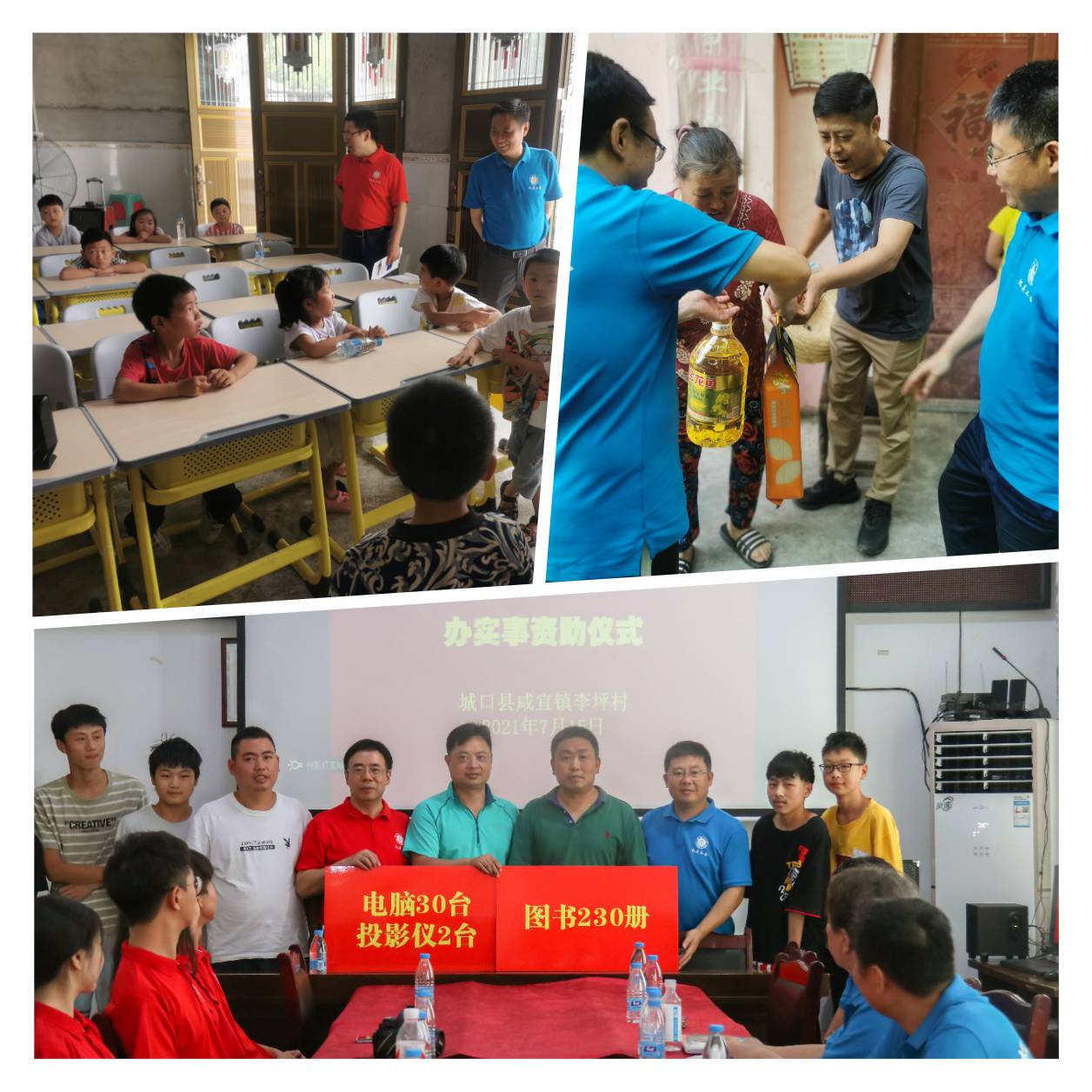 关爱农村儿童,助力振兴乡村教育。由于基础教育资源的短缺,农村基础教育相对落后,李坪村在驻村第一书记何定龙同志的带领下,建立了李坪村青少年素质拓展中心。该中心面向李坪村适龄儿童开设幼儿园、小学、初中、高中的相关课程和辅导,并邀请到西南大学的青年学生在假期开展义务支教活动。机关教职工志愿服务队得知该中心情况后,立即在西南大学筹集教辅设备,向中心支援了一体机电脑30台、投影仪2台、白板4块等教辅用具,同时,慰问了西南大学赴李坪村开展暑期支教的大学生志愿者。