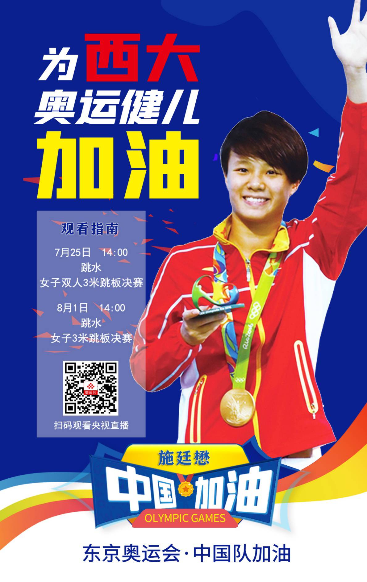 北京时间7月25日下午两点,东京奥运会跳水女子双人3米跳板决赛拉开帷幕,卫冕冠军施廷懋/王涵组合代表跳水梦之队出战,以稳定的发挥,牢牢把握住排名榜首的领先优势,以绝对实力获得中国代表团的第四枚金牌!这块金牌也是施廷懋个人第三枚奥运金牌,也是西大学子在本届奥运会的斩获的第一枚金牌。