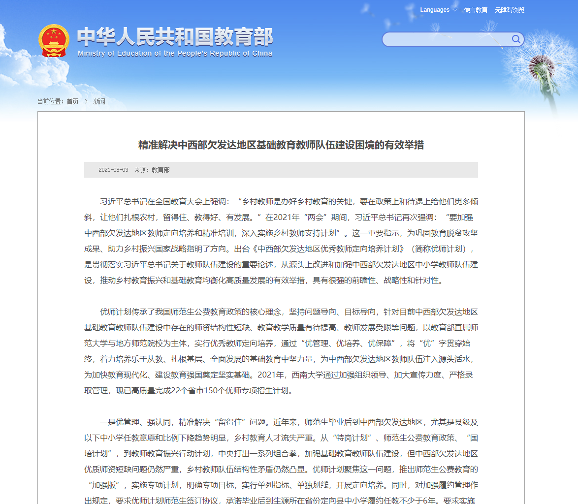 优师计划传承了我国师范生公费教育政策的核心理念,坚持问题导向、目标导向,针对目前中西部欠发达地区基础教育教师队伍建设中存在的师资结构性短缺、教育教学质量有待提高、教师发展受限等问题,以教育部直属师范大学与地方师范院校为主体,实行优秀教师定向培养,通过“优管理、优培养、优保障”,将“优”字贯穿始终,着力培养乐于从教、扎根基层、全面发展的基础教育中坚力量,为中西部欠发达地区教师队伍注入源头活水,为加快教育现代化、建设教育强国奠定坚实基础。2021年,西南大学通过加强组织领导、加大宣传力度、严格录取管理,现已高质量完成22个省市150个优师专项招生计划。