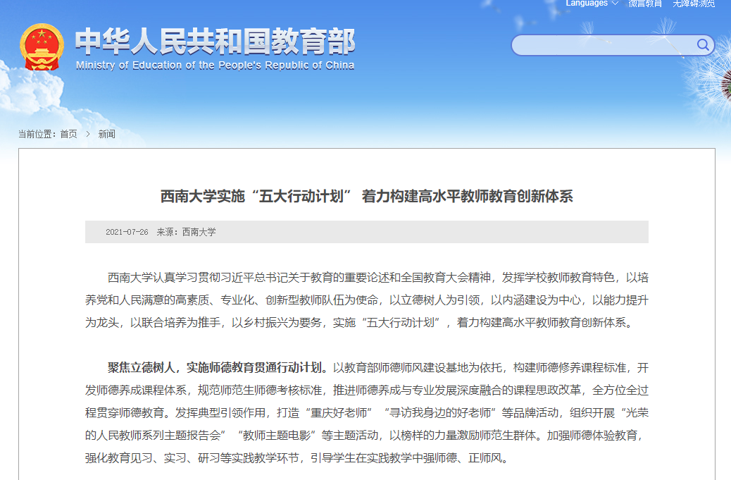 西南大学认真学习贯彻习近平总书记关于教育的重要论述和全国教育大会精神,发挥学校教师教育特色,以培养党和人民满意的高素质、专业化、创新型教师队伍为使命,以立德树人为引领,以内涵建设为中心,以能力提升为龙头,以联合培养为推手,以乡村振兴为要务,实施“五大行动计划”,着力构建高水平教师教育创新体系。
