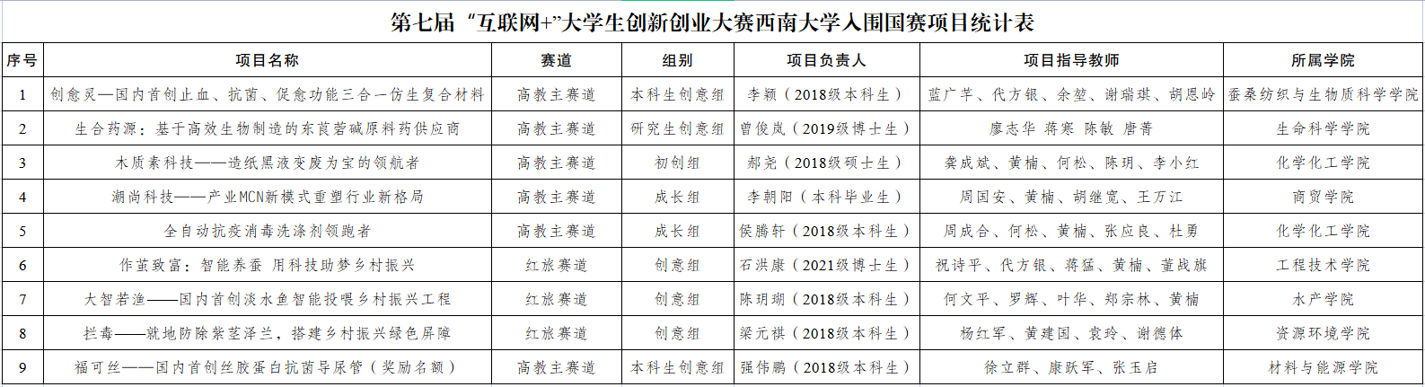 第七届中国国际“互联网+”大学生创新创业大赛重庆赛区选拔赛于8月下旬落下帷幕。西南大学学生团队在47所高校报名参赛的三万余个项目中脱颖而出,获得了29金9银1铜的优异成绩,金奖数量是去年市赛的近3倍。同时一个项目获得重庆市第三届青年大学生创客秀最佳创意奖、最具商业价值奖,一个项目获得第七届中国国际“互联网+”大学生创新创业大赛“七个一百”系列活动乡村振兴奖,学校荣获高教主赛道先进集体、青年红色筑梦之旅赛道先进集体称号。
