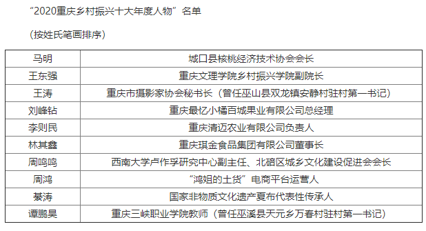 此次评选活动由重庆市委宣传部、市委网信办、市农业农村委、市乡村振兴局指导,重庆日报报业集团主办、重庆日报承办,共设置“2020重庆乡村振兴十大年度人物”“2020重庆乡村振兴十大示范案例”两个奖项。活动自今年3月启动,经过半年时间的征集评选,9月15日完成终审,22日公示结束。