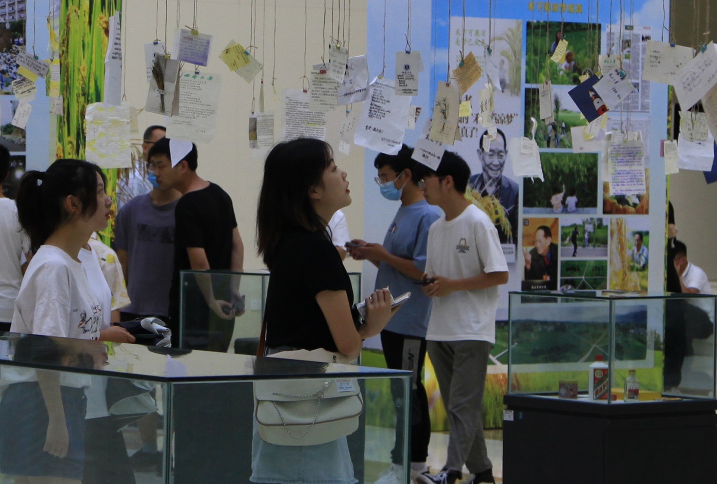 “这个排球,是我敬献的,我写的字都还依稀可见。”体育学院青年教师李进看到展柜中的排球激动地说。师生们走进展区,端详着一张张照片,再次翻看那些用麻绳吊着的纸片,看着那些令人泪目的话语,心中充满对袁隆平的无尽缅怀和追思。