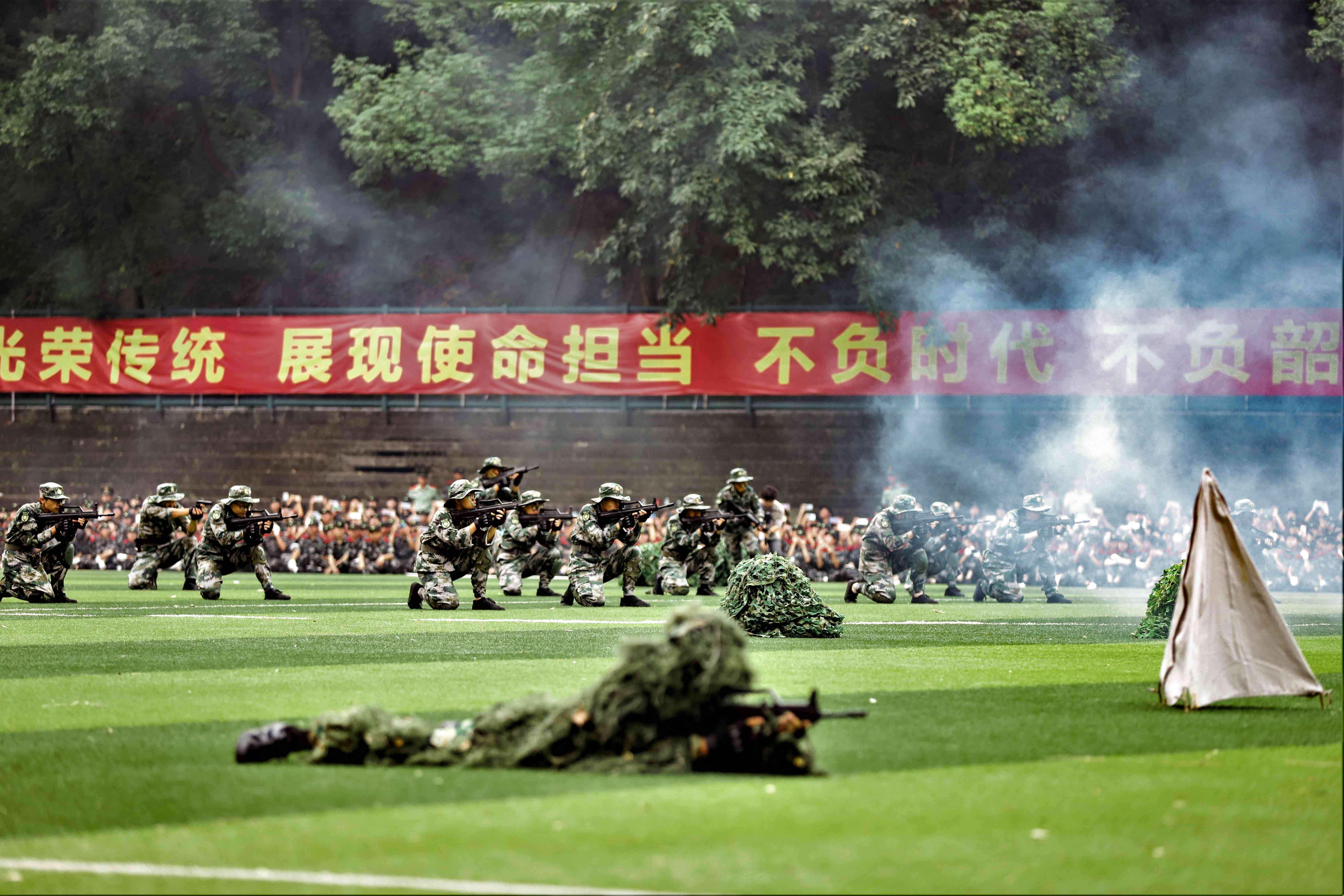 拳拳报国志,沙场秋点兵。9月27日上午,学校2021级本科生军训汇报展演暨总结大会在北碚校区第一运动场和荣昌校区运动场同步举行。校长、军训领导小组组长、军训师师长张卫国,学校党委副书记安春元,学校党委副书记、军训领导小组副组长、军训师副政委潘洵出席活动,军训领导小组成员单位,承训部队全体教导员、各学院(部)参训干部,2021级全体本科生参加。