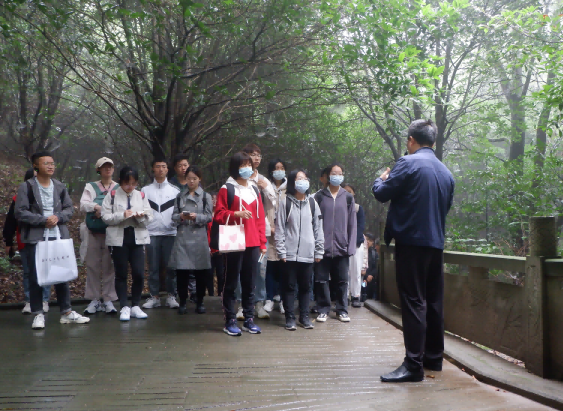 在缙云山珍稀植物保护区,同学们学习了解缙云山特有物种缙云黄芩的有关保护知识。缙云黄芩是重庆市首批重点保护野生植物之一,因其繁殖能力较低,已被确定为重庆市极小种群野生植物拯救保护对象,目前对缙云黄芩的保护仍然十分迫切,学院专家在缙云黄芩的拯救保护方面有较为深入的研究,已初步建立起缙云黄芩人工繁育基地。