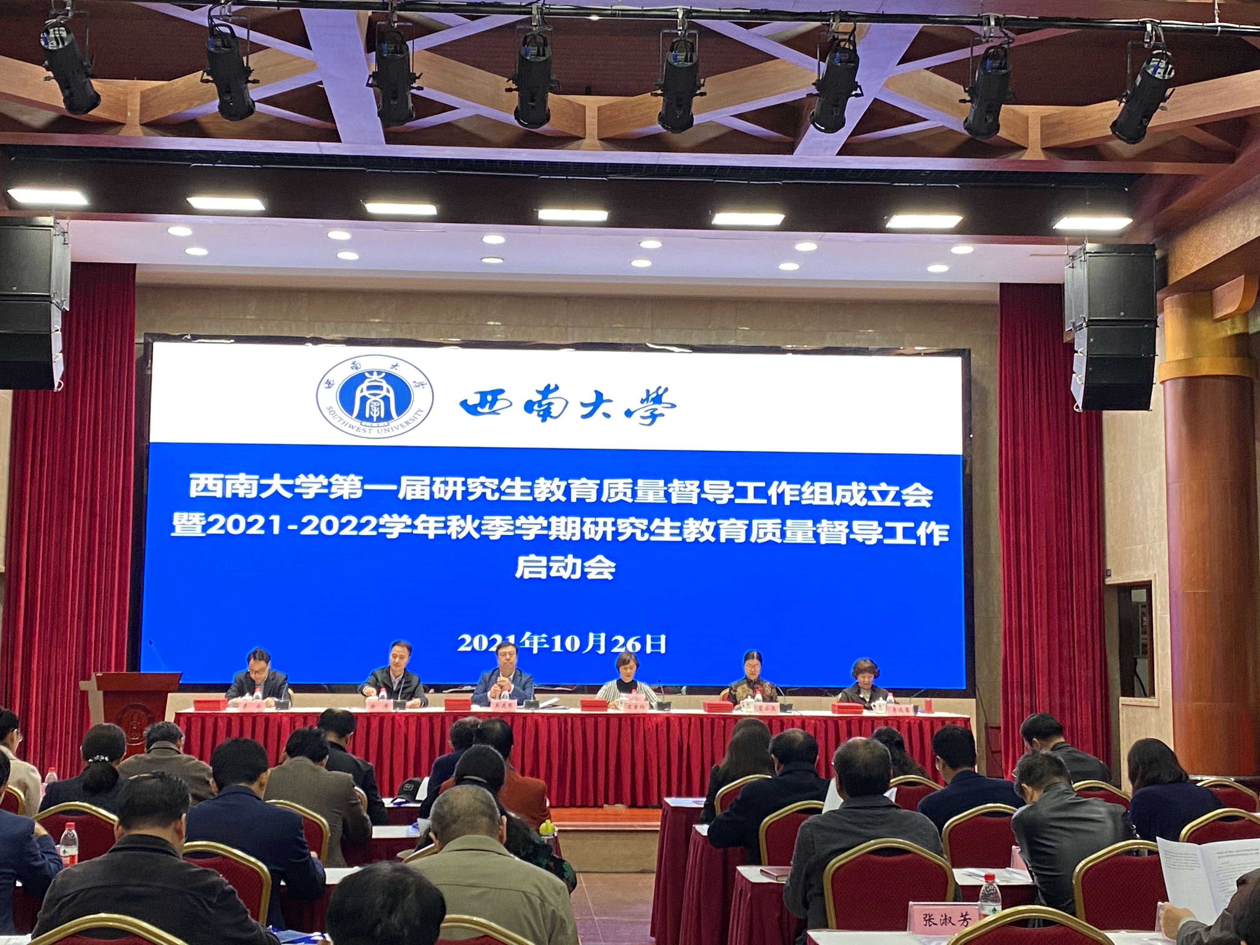 10月26日下午,学校第一届研究生教育质量督导工作组成立会暨2021-2022学年秋季学期研究生教育质量督导工作启动会在西南大学东方红会议厅召开。会议旨在贯彻全国研究生教育会议精神,加强研究生培养质量的监督管理,健全研究生教育质量监督体系,助力研究生教育高质量发展,走上教指委领航、督导组护航的高质量发展道路,在“督教”“督管”“督学”与“导教”“导管”“导学”方面切实发挥作用。