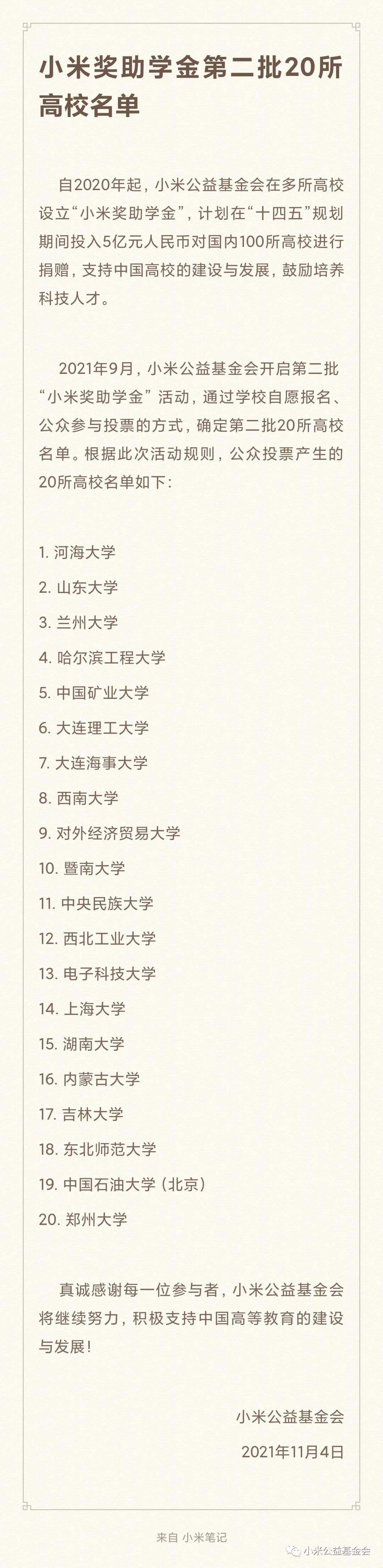 2021年9月,小米公益基金会正式开启第二批“小米奖助学金”高校报名活动,以学校自愿报名、公众参与投票的方式,最终确定第二批20所高校名单(首批资助高校除外)。