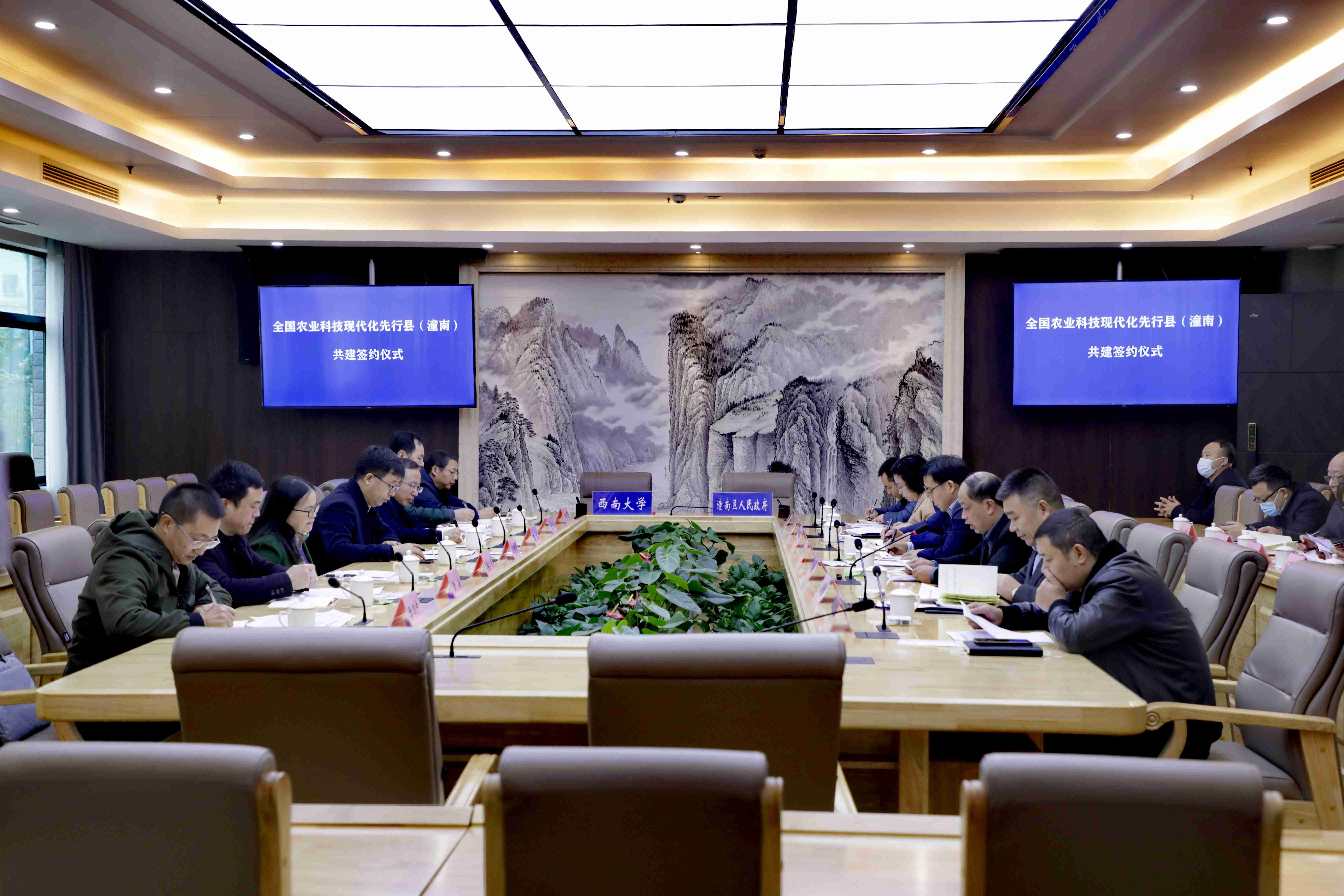会议通报全国农业科技现代化先行县共建工作前期推进情况,审议并通过共建方案。赵国华和罗全良代表校地双方签署《潼南区人民政府·西南大学共建全国农业科技现代化先行县合作协议》。协议约定,“十四五”期间,区校双方将围绕全国农业科技现代化先行县创建总体要求,在农业关键技术攻关、农科教协同创新基地建设、智慧农业试验区建设、农业技术创新与服务平台建设、生态宜居乡村建设、新型经营主体培育、产业人才培养等方面开展深入合作,努力探索形成高校科技支撑县域经济发展、服务乡村振兴的新模式。