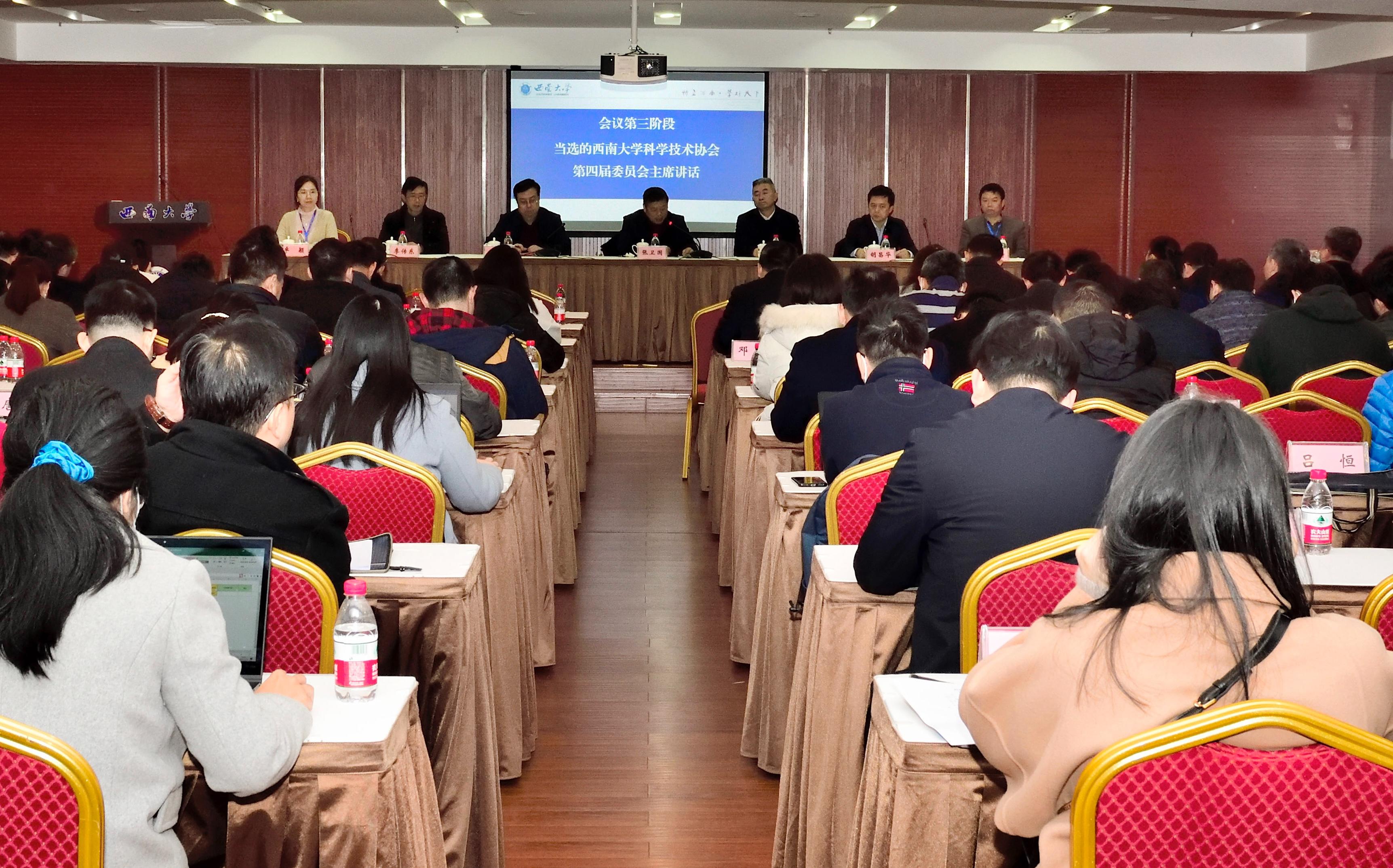 安春元宣读中共西南大学委员会《关于同意召开西南大学科学技术协会第四次代表大会的批复》并致辞。安春元在致辞中表示,希望全校科技工作者紧跟党走,结合学校优势特色,加强对外联系;希望学校科协积极适应新形势,充分发挥好联系科技工作者的桥梁纽带作用。